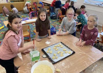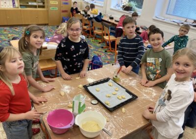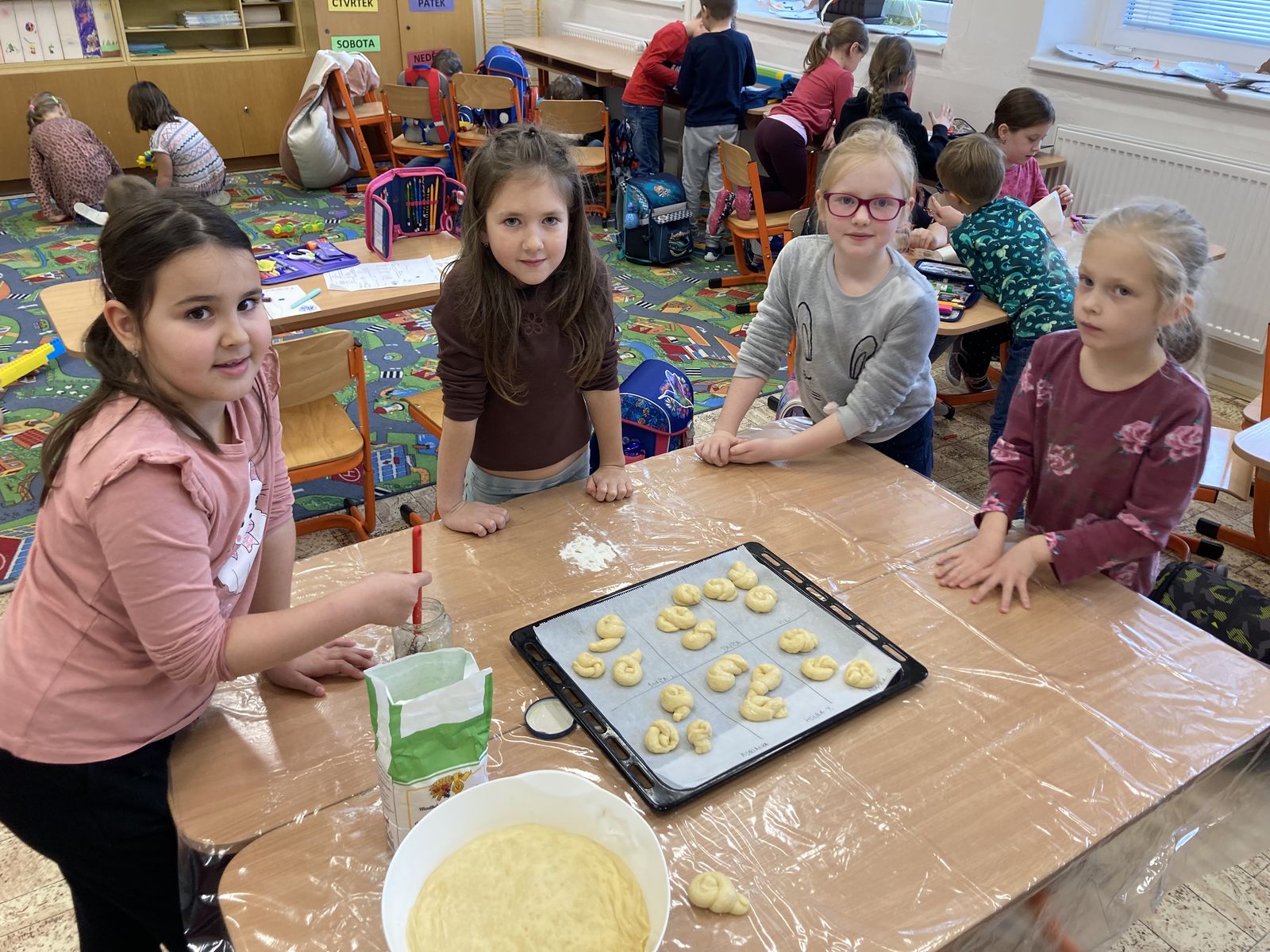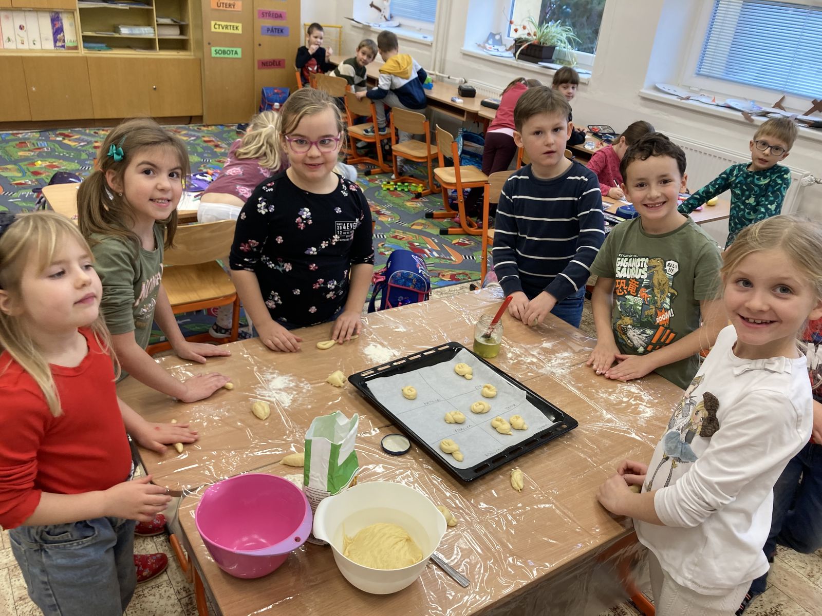 Během celého školního roku krášlíme naši školu svými výtvarnými výtvory. Čteme s dětmi knížky, chodíme na školní zahradu a teď v zimě do tělocvičny. Využíváme i školní kuchyňku.