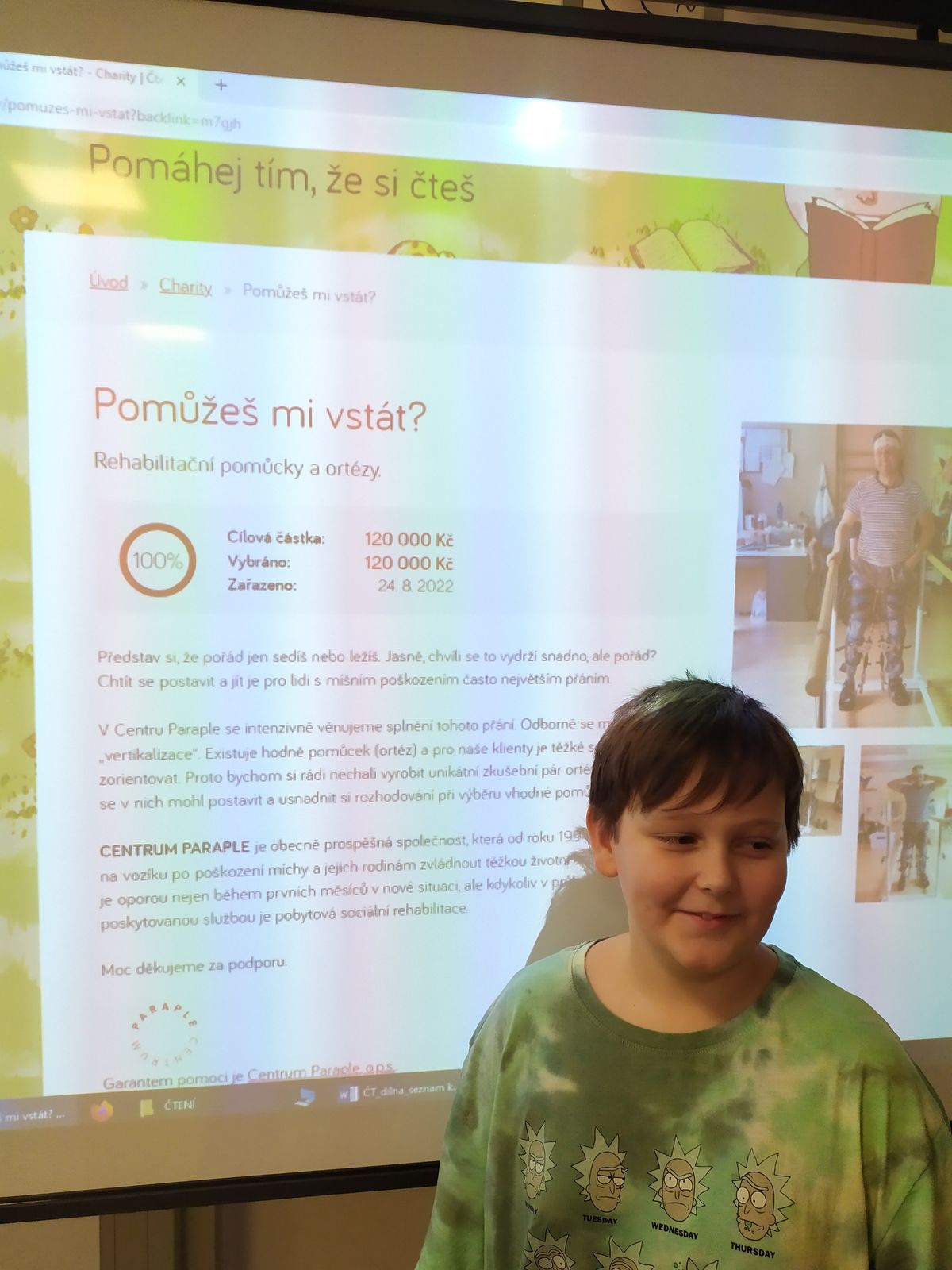 A protože je baví číst, spojili potěšení ze čtení s radostí z pomoci druhým. Prostřednictvím projektu Čtení pomáhá, získali po přečtení knihy a úspěšném vyplnění testu kredit padesát korun, který věnovali na jeden z nominovaných projektů.
