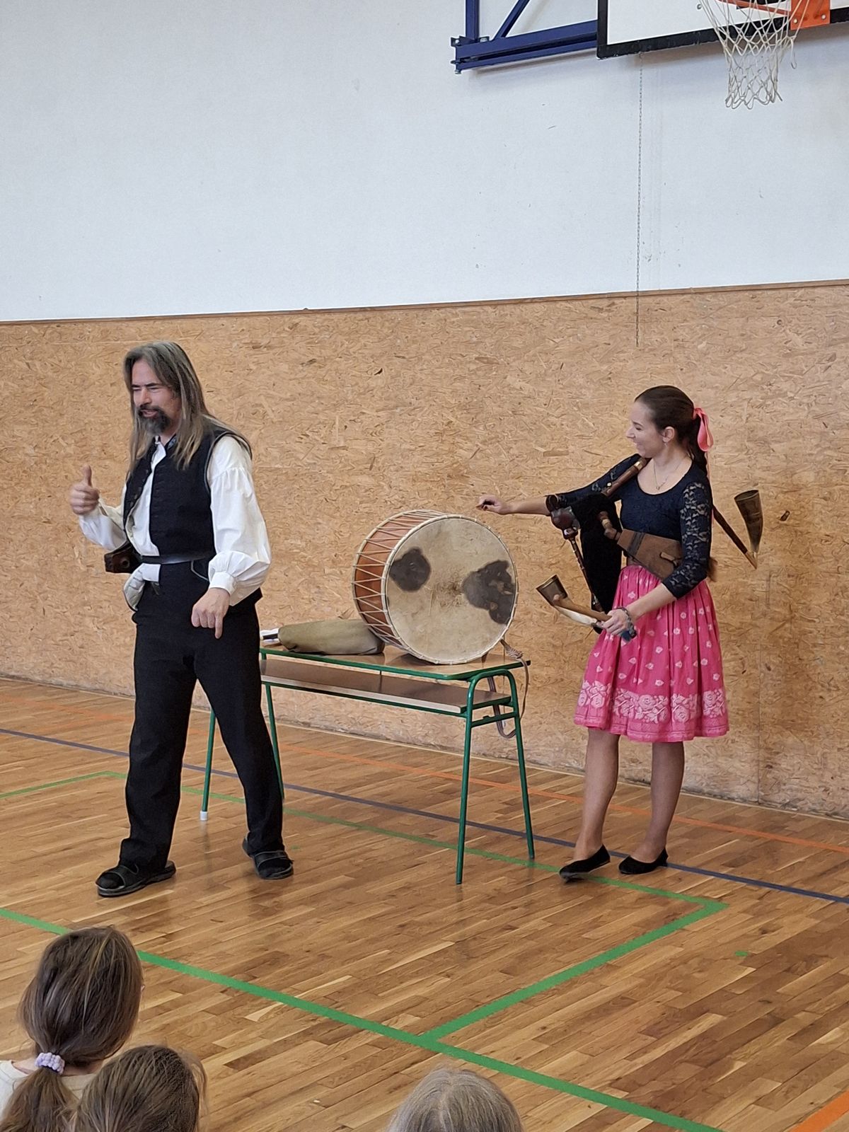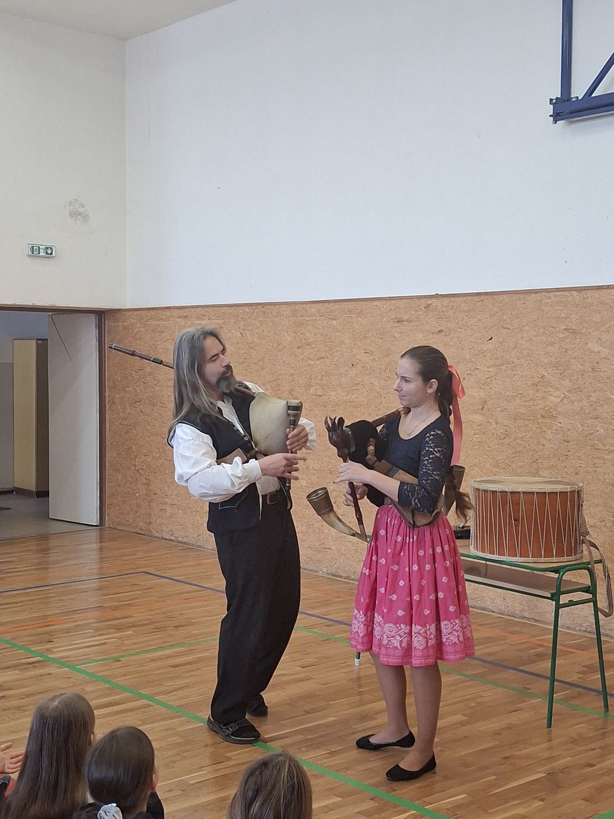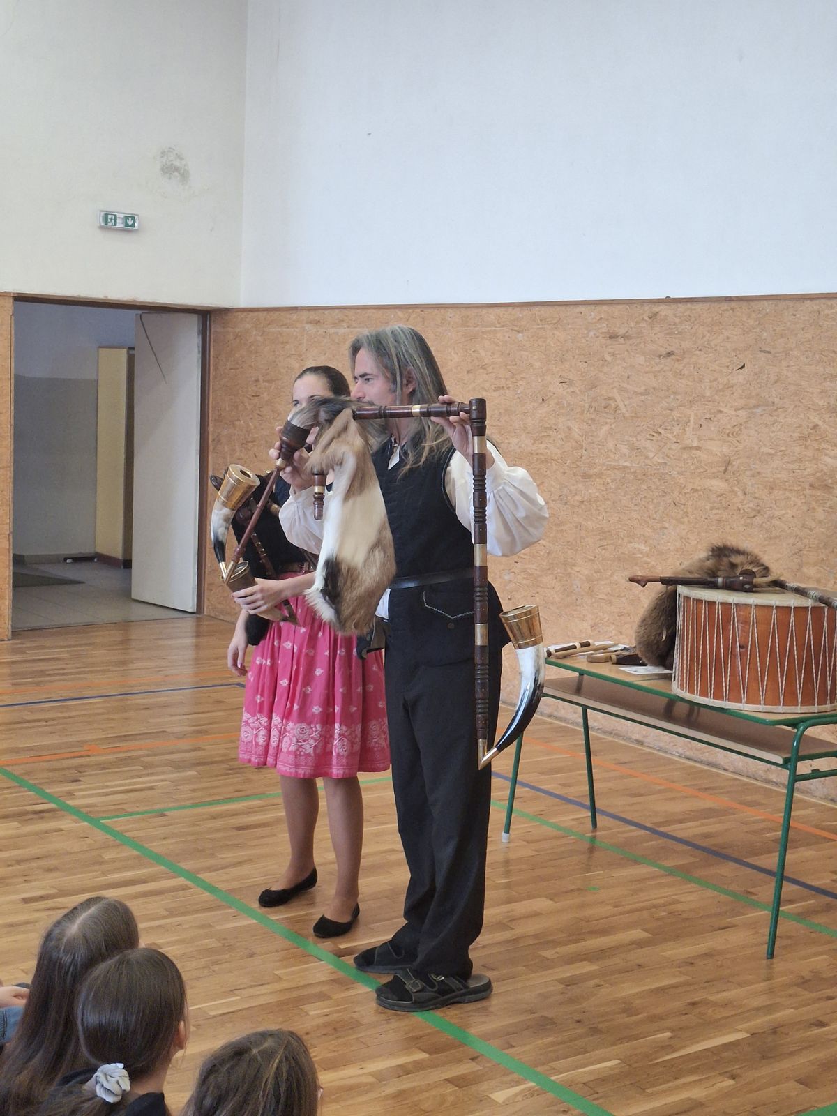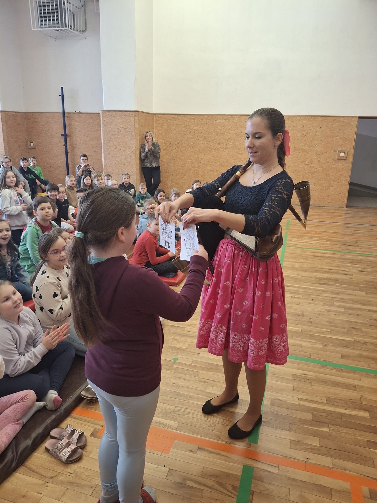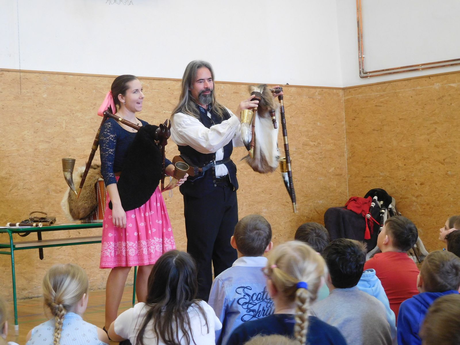 Ve čtvrtek 6. 3. za námi přijeli Dudáci – Ondřej a Lucie Tryhuci se svým programem. Pro děti z MŠ a žáky 1. – 6. ročníku si připravili hudební pásmo „S kozlíkem na cestách“, kde dětem představili neobvyklý hudební nástroj dudy. S kozlíkem, jak se říkalo českým dudám, se děti podívaly na dudy z celého světa a mohly jejich tvar i zvuk porovnat. Dětem byly představeny dudy z Chorvatska, Španělska, Skotska, Slovenska a našeho rodného Brna. Dudy doprovázel i velký buben. O další rytmiku se postaraly děti, kdy vytleskáváním a podupáváním doprovázely písničky. Dudáci hráli a zpívali lidové písničky i skladby z pohádek. Za správné odpovědi, kdy děti poznávaly melodie, dostaly autorské omalovánky. Ondřej Tryhuk a jeho manželka Lucie nám ukázali, že se na dudy dají hrát jak lidové písně, tak i moderní nebo klasická hudba.