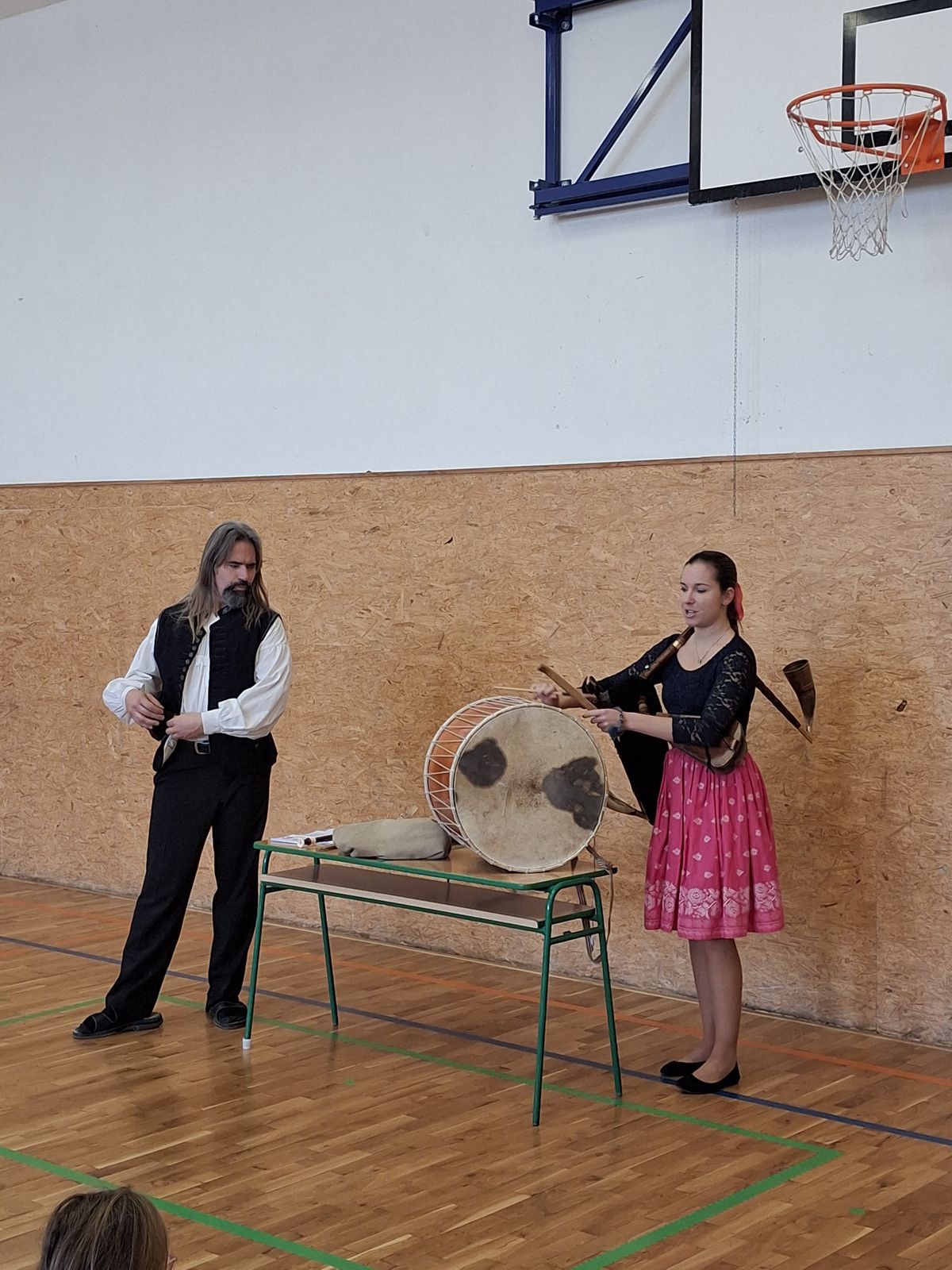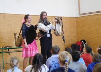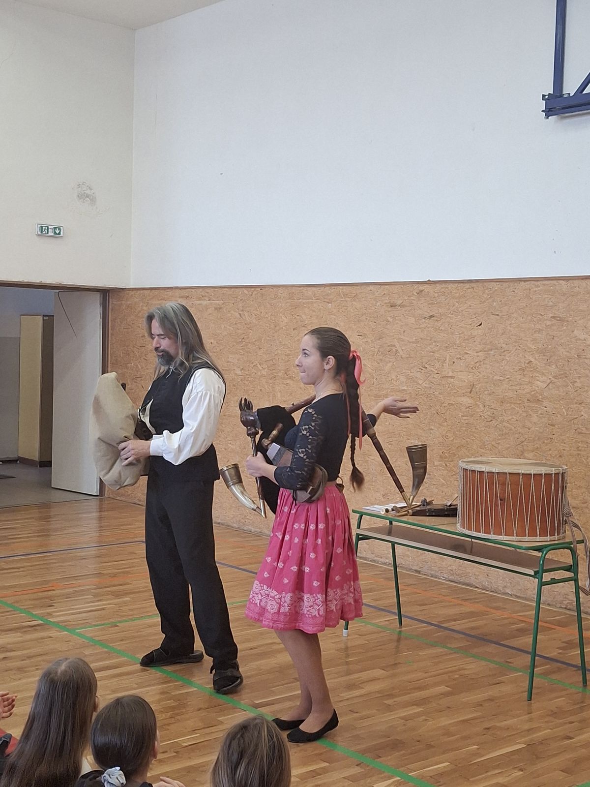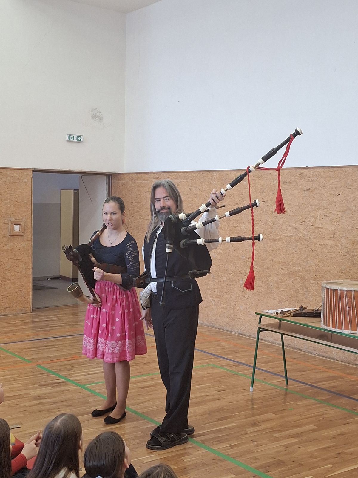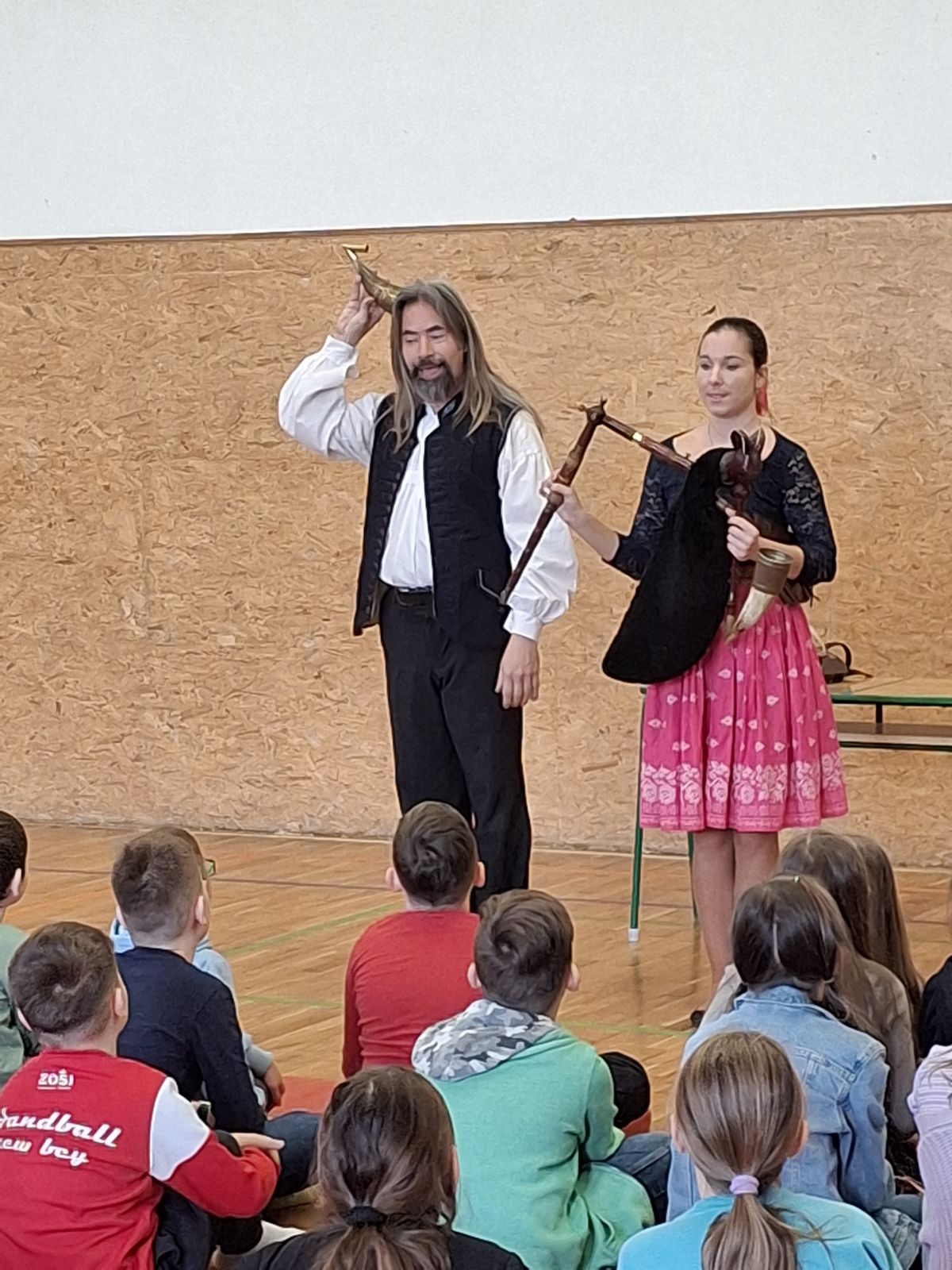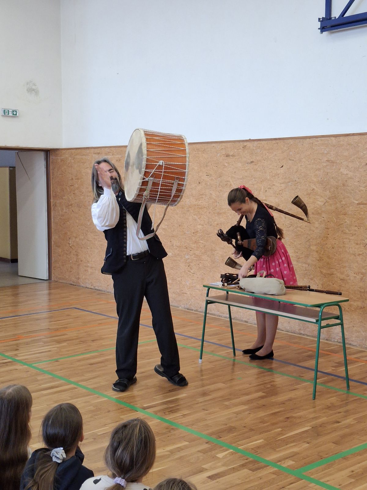 Ve čtvrtek 6. 3. za námi přijeli Dudáci – Ondřej a Lucie Tryhuci se svým programem. Pro děti z MŠ a žáky 1. – 6. ročníku si připravili hudební pásmo „S kozlíkem na cestách“, kde dětem představili neobvyklý hudební nástroj dudy. S kozlíkem, jak se říkalo českým dudám, se děti podívaly na dudy z celého světa a mohly jejich tvar i zvuk porovnat. Dětem byly představeny dudy z Chorvatska, Španělska, Skotska, Slovenska a našeho rodného Brna. Dudy doprovázel i velký buben. O další rytmiku se postaraly děti, kdy vytleskáváním a podupáváním doprovázely písničky. Dudáci hráli a zpívali lidové písničky i skladby z pohádek. Za správné odpovědi, kdy děti poznávaly melodie, dostaly autorské omalovánky. Ondřej Tryhuk a jeho manželka Lucie nám ukázali, že se na dudy dají hrát jak lidové písně, tak i moderní nebo klasická hudba.