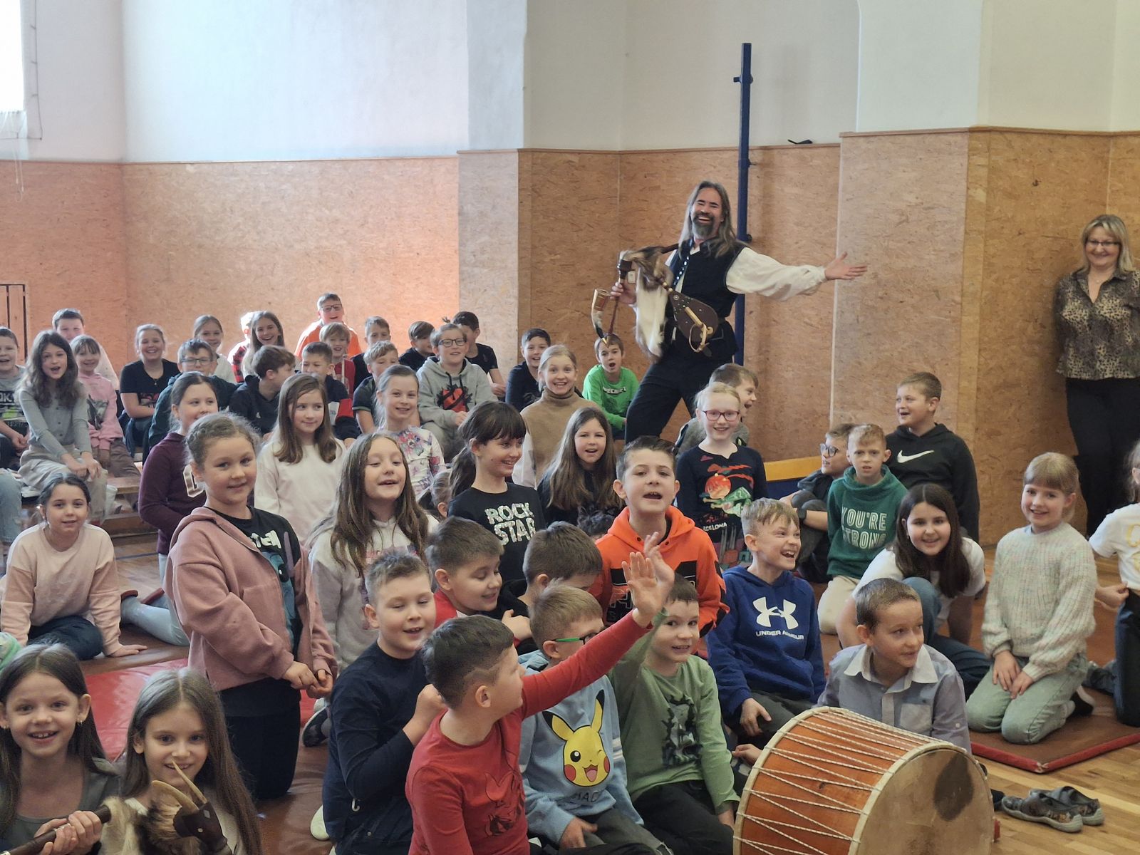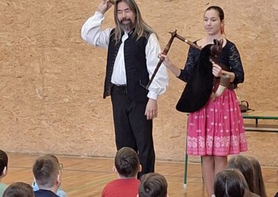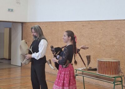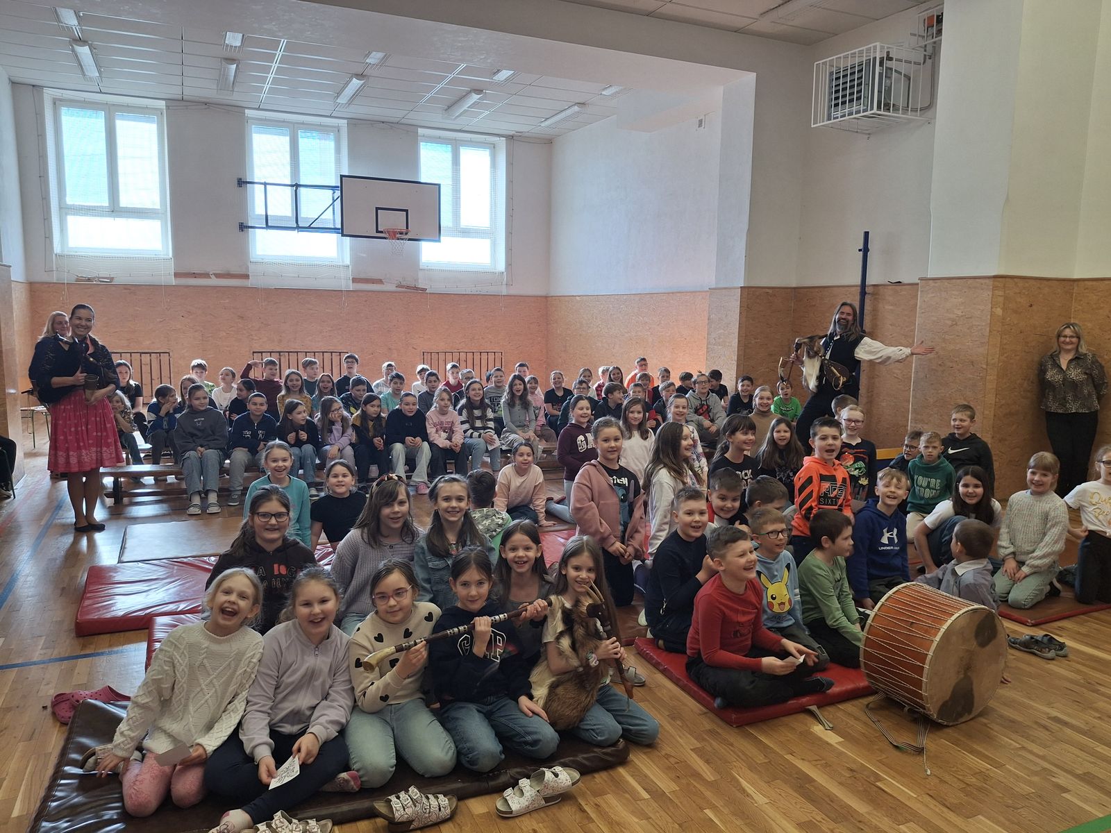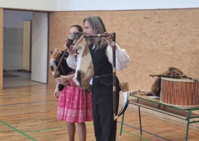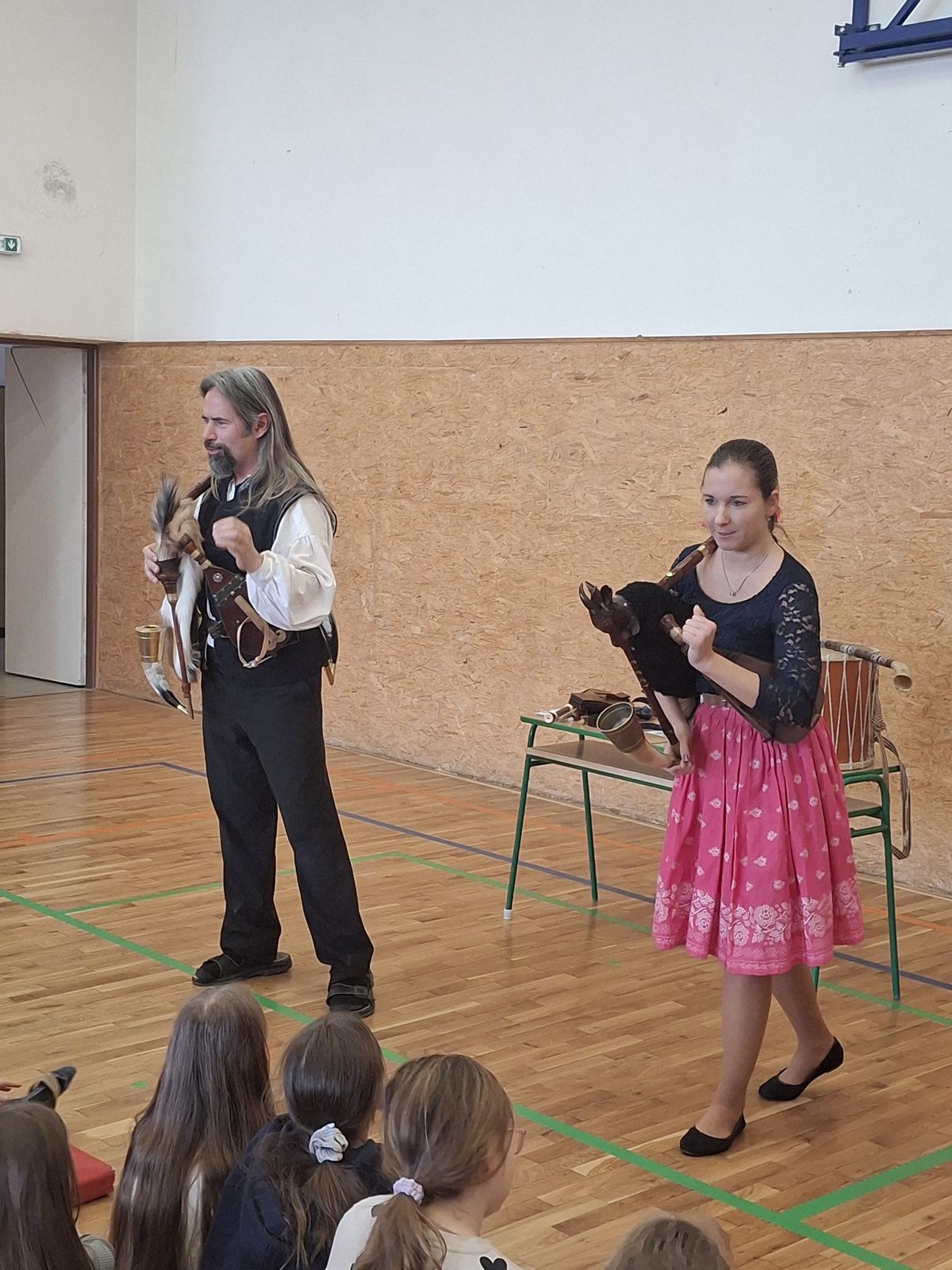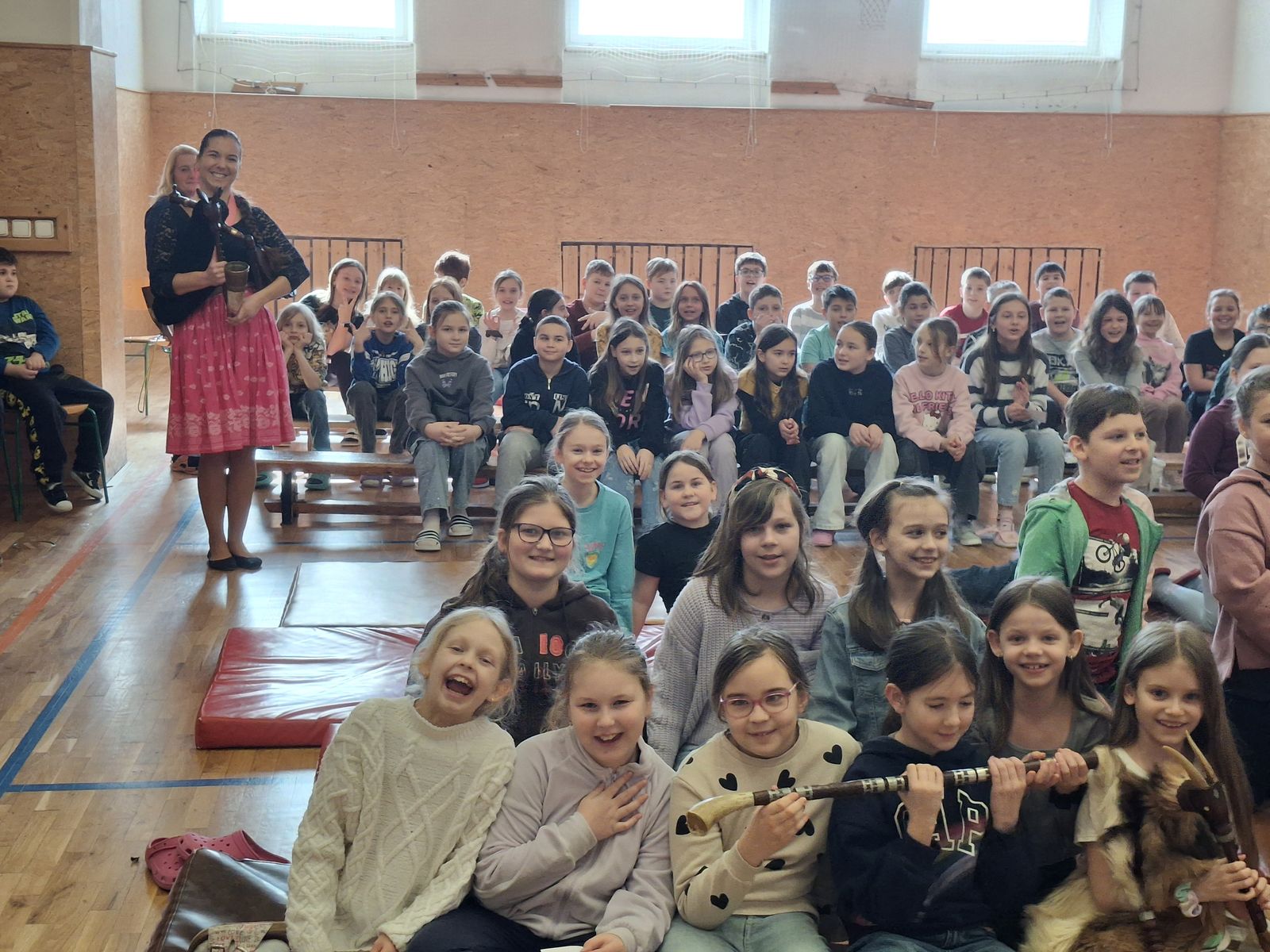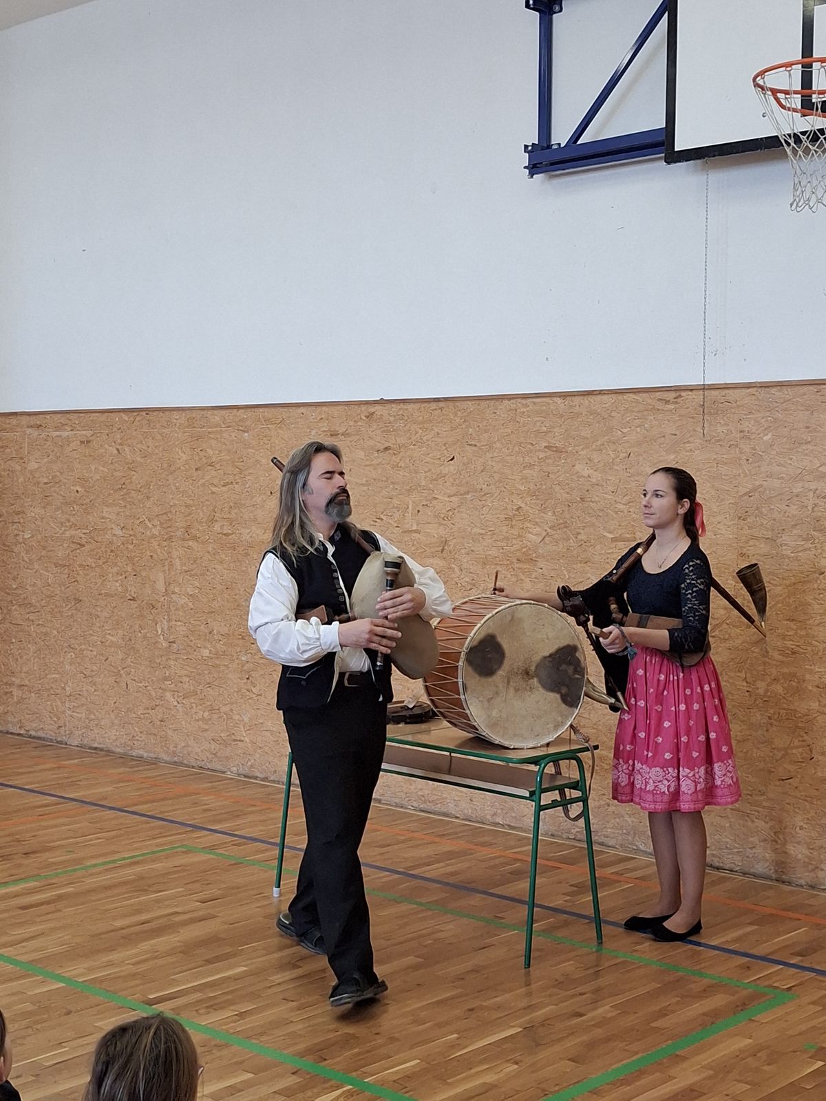 Ve čtvrtek 6. 3. za námi přijeli Dudáci – Ondřej a Lucie Tryhuci se svým programem. Pro děti z MŠ a žáky 1. – 6. ročníku si připravili hudební pásmo „S kozlíkem na cestách“, kde dětem představili neobvyklý hudební nástroj dudy. S kozlíkem, jak se říkalo českým dudám, se děti podívaly na dudy z celého světa a mohly jejich tvar i zvuk porovnat. Dětem byly představeny dudy z Chorvatska, Španělska, Skotska, Slovenska a našeho rodného Brna. Dudy doprovázel i velký buben. O další rytmiku se postaraly děti, kdy vytleskáváním a podupáváním doprovázely písničky. Dudáci hráli a zpívali lidové písničky i skladby z pohádek. Za správné odpovědi, kdy děti poznávaly melodie, dostaly autorské omalovánky. Ondřej Tryhuk a jeho manželka Lucie nám ukázali, že se na dudy dají hrát jak lidové písně, tak i moderní nebo klasická hudba.
