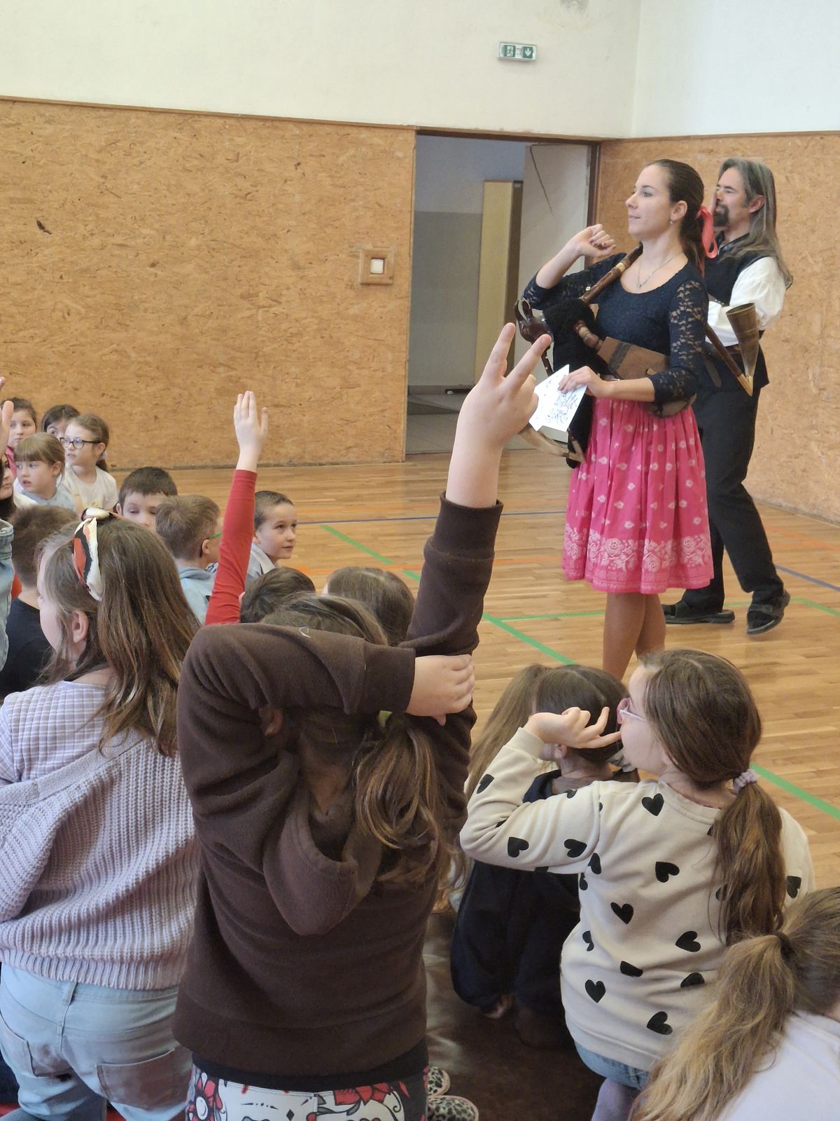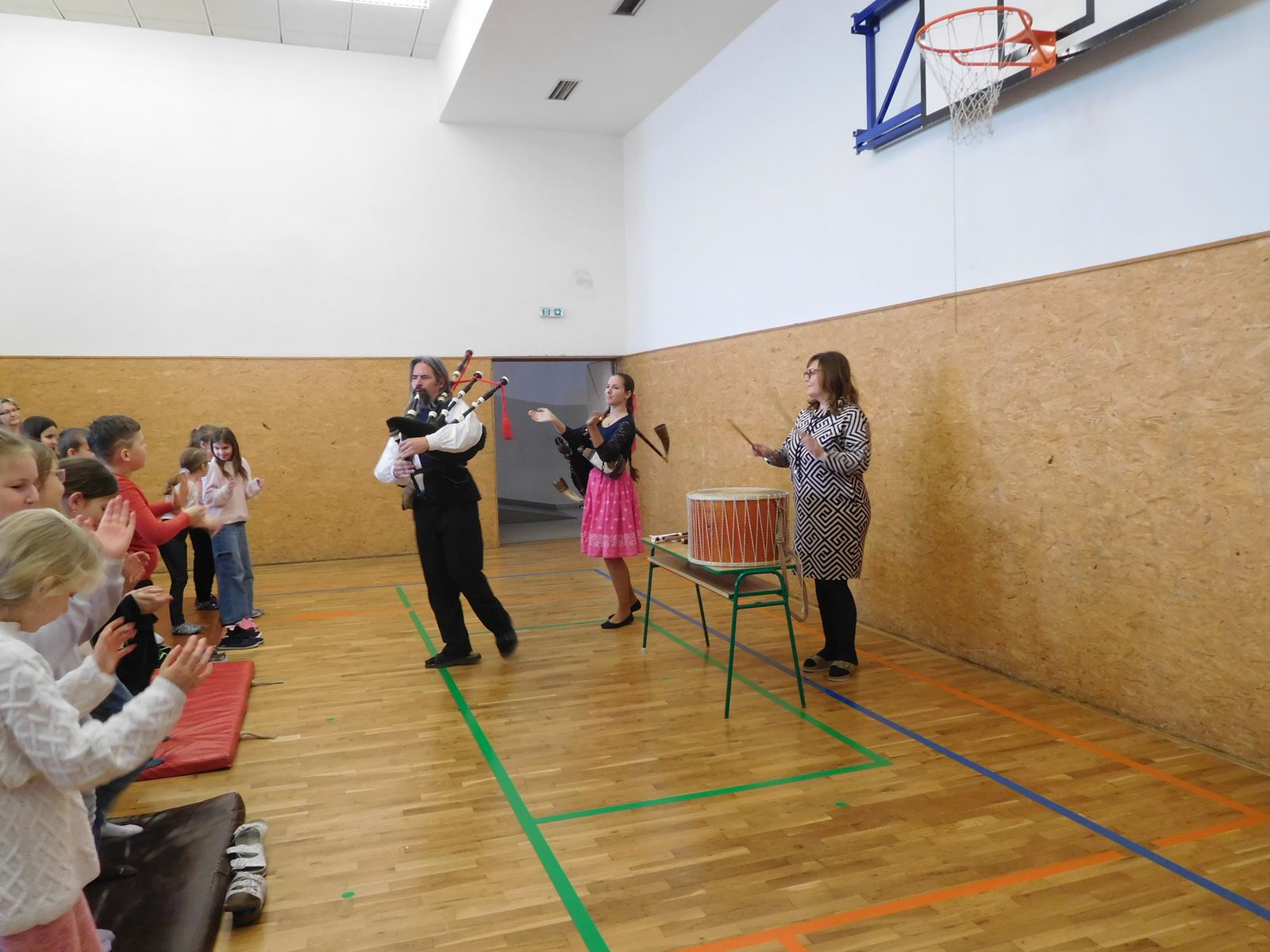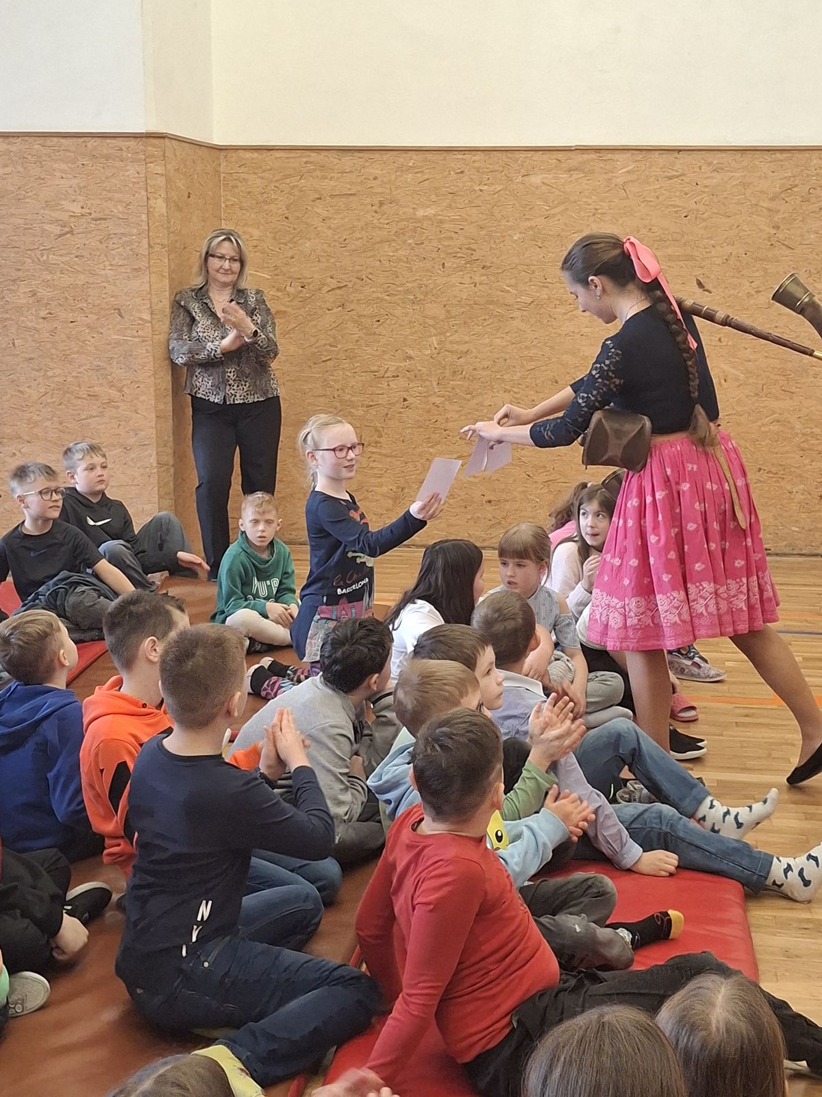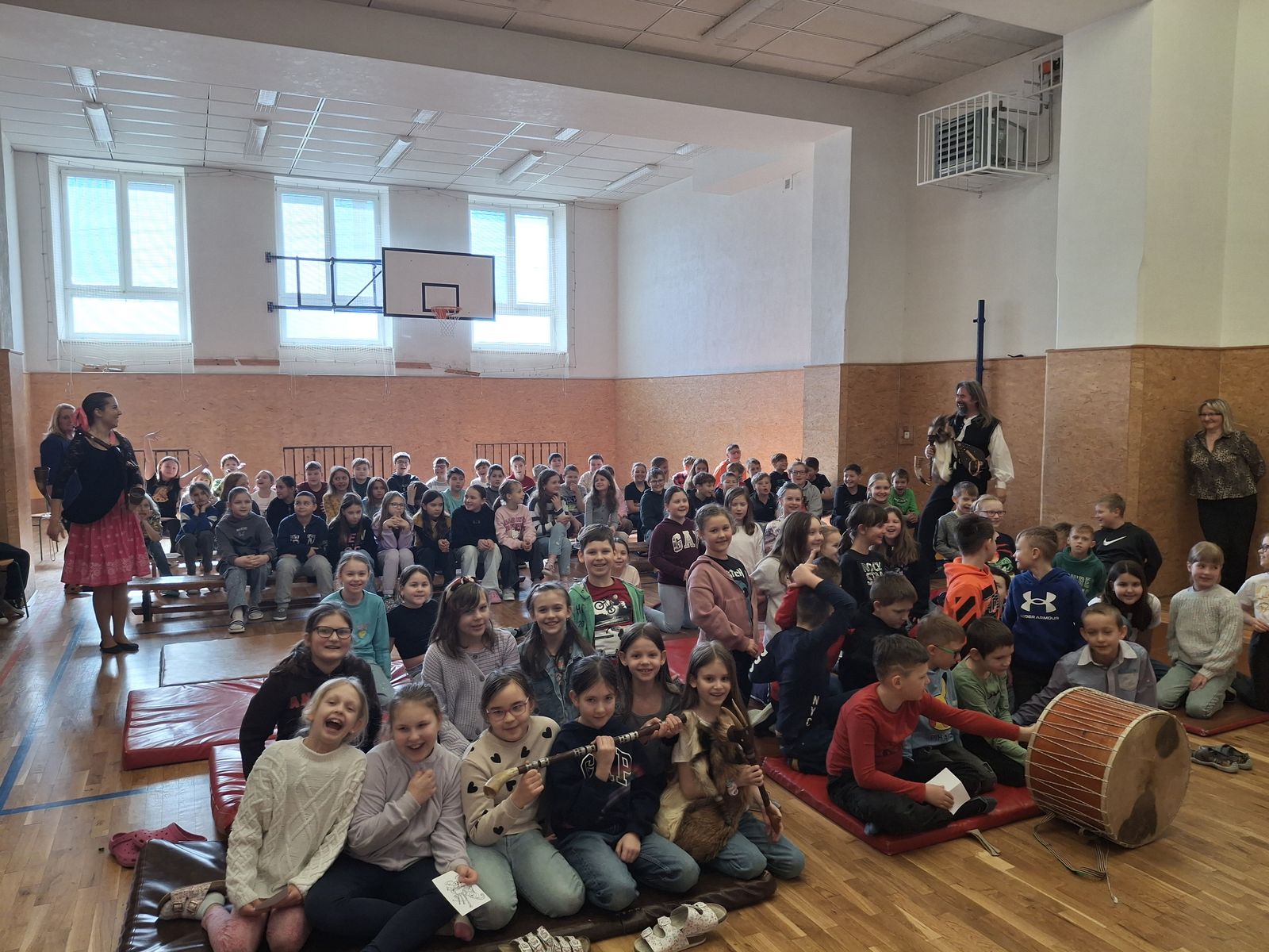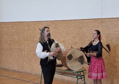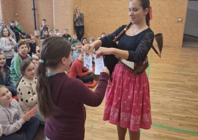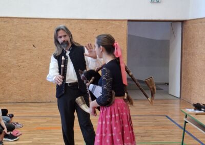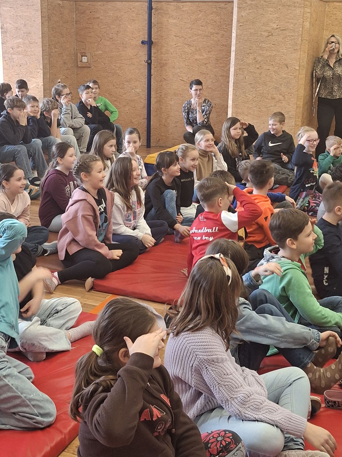 Ve čtvrtek 6. 3. za námi přijeli Dudáci – Ondřej a Lucie Tryhuci se svým programem. Pro děti z MŠ a žáky 1. – 6. ročníku si připravili hudební pásmo „S kozlíkem na cestách“, kde dětem představili neobvyklý hudební nástroj dudy. S kozlíkem, jak se říkalo českým dudám, se děti podívaly na dudy z celého světa a mohly jejich tvar i zvuk porovnat. Dětem byly představeny dudy z Chorvatska, Španělska, Skotska, Slovenska a našeho rodného Brna. Dudy doprovázel i velký buben. O další rytmiku se postaraly děti, kdy vytleskáváním a podupáváním doprovázely písničky. Dudáci hráli a zpívali lidové písničky i skladby z pohádek. Za správné odpovědi, kdy děti poznávaly melodie, dostaly autorské omalovánky. Ondřej Tryhuk a jeho manželka Lucie nám ukázali, že se na dudy dají hrát jak lidové písně, tak i moderní nebo klasická hudba.