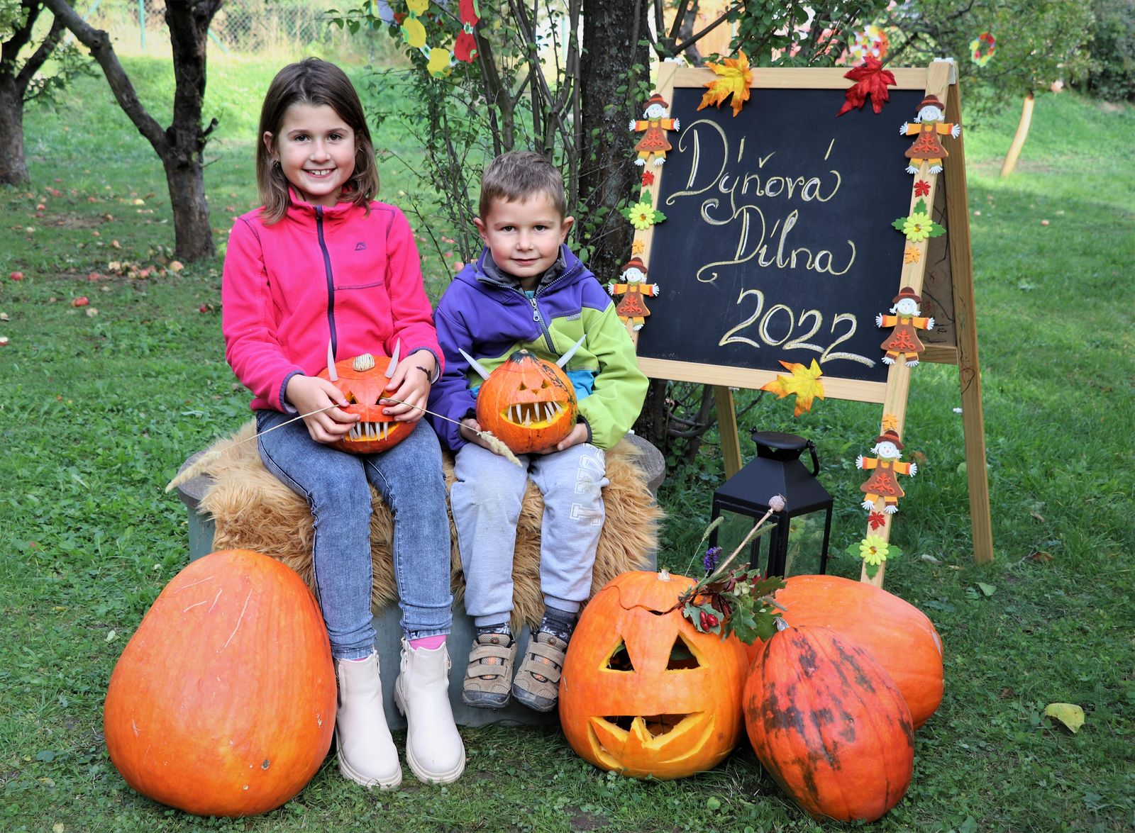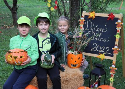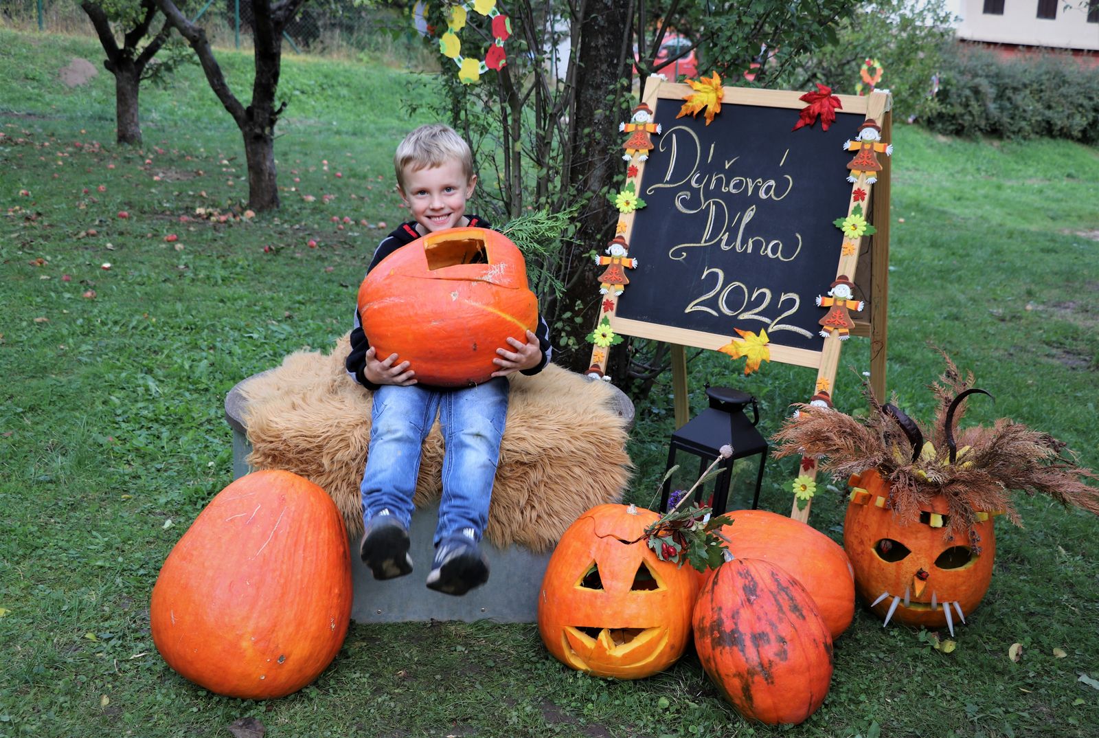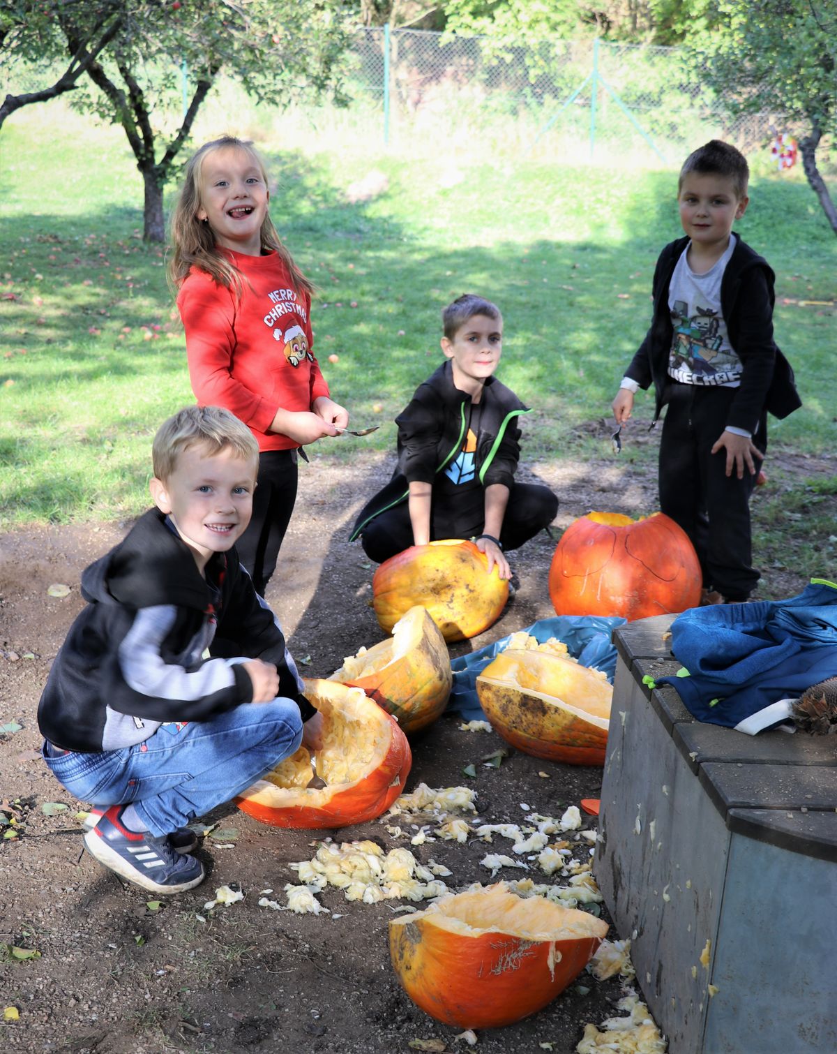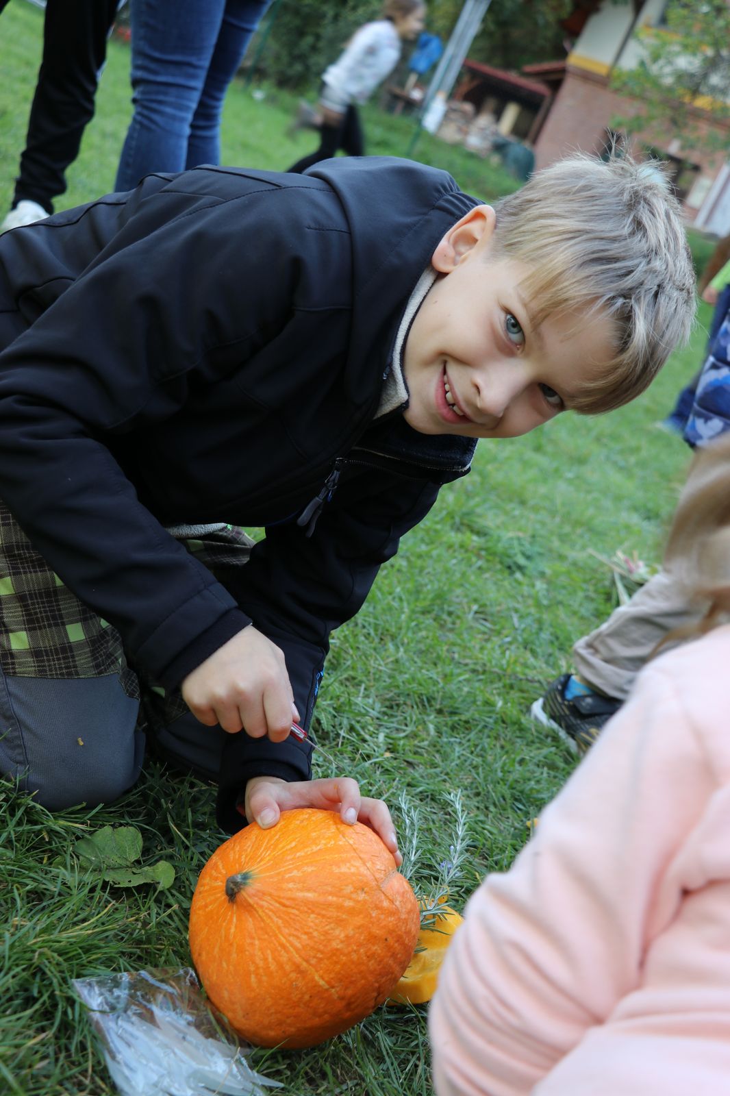Letos všechno začalo na poli v Kupařovicích. Tímto bychom chtěli ještě jednou poděkovat paní Kratochvílové, která nám věnovala krásné dýně. Paní vychovatelky napekly dobroty a nazdobily školní zahradu. Ve čtvrtek 29. 9. v 16 hodin se zahrada zaplnila dětmi a jejich rodiči. Vyřezávání a zdobení dýní jsme si všichni užili. Děti se měly možnost vyfotit se svými výtvory v podzimním fotokoutku a pořídit si tak vzpomínku na dýňovou dílnu.