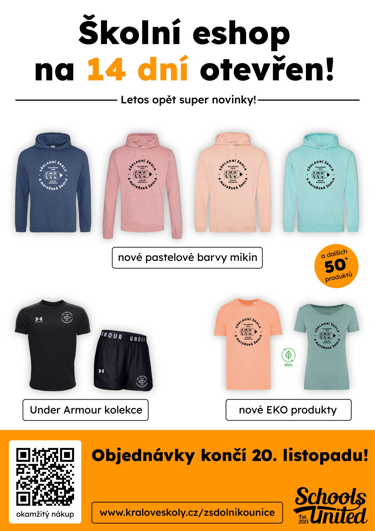 rádi bychom Vám touto cestou opět předali odkaz na náš e-shop se školním oblečením. Nechali jsme si jako škola vytvořit svoji vlastní volnočasovou školní kolekci oblečení, jejíž náhled můžete vidět níže a kterou je možné si aktuálně pořídit na našem eshopu zde: https://www.kraloveskoly.cz/zsdolnikounice/