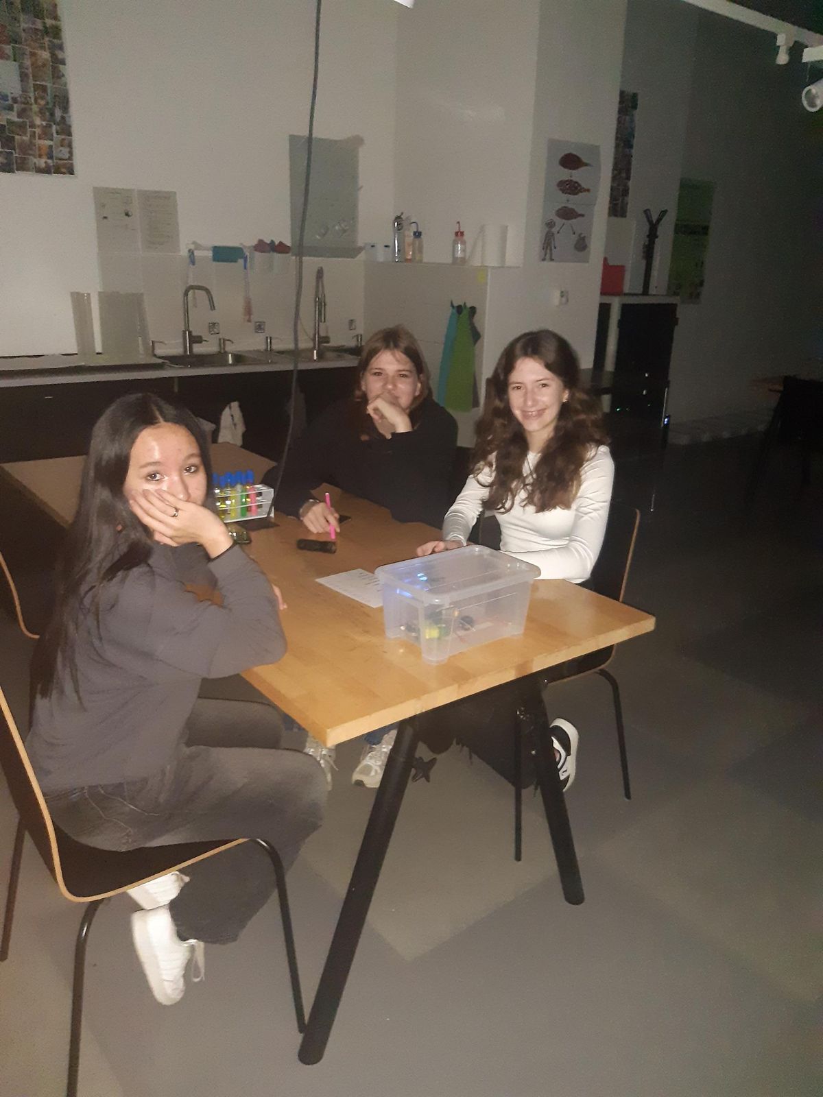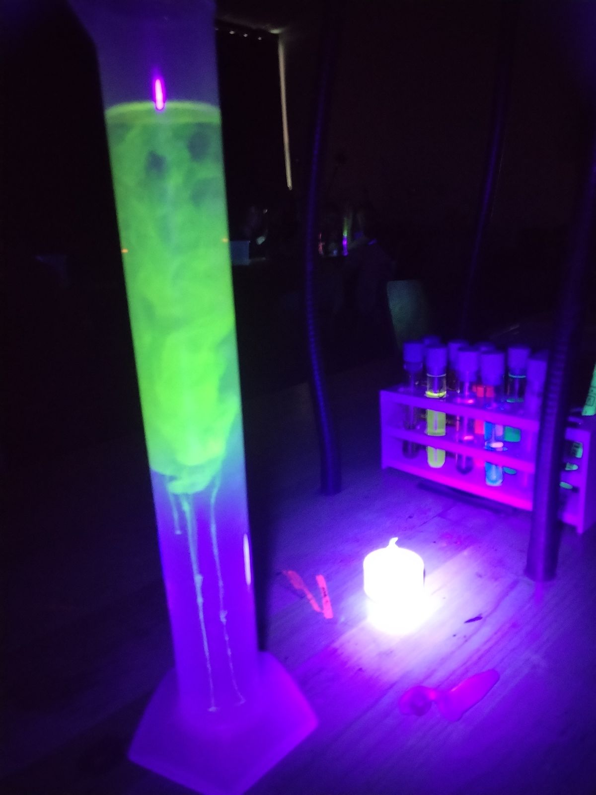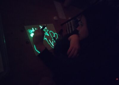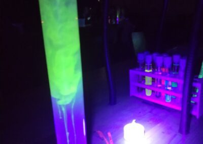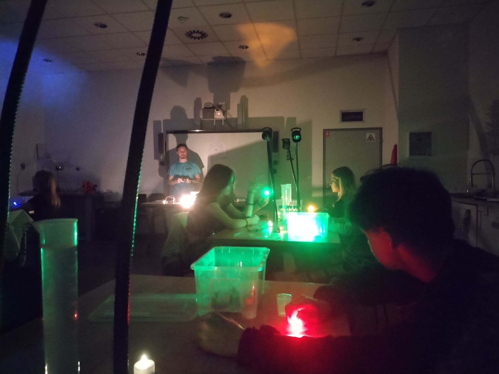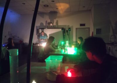 Po přestávce na oběd jsme se přesunuli do laboratoří a ve skupinkách si sami vyzkoušeli pokusy na téma LUMINISCENCE. Získali jsme přehled o jednotlivých druzích luminiscence a fosforescence. Zkoumali jsme fotoluminiscenční roztoky pomocí UV baterek a laserů. Propojili jsme znalosti fyziky (elektromagnetické a světelné děje) se znalostmi z chemie (částicové složení látek a chemické reakce).