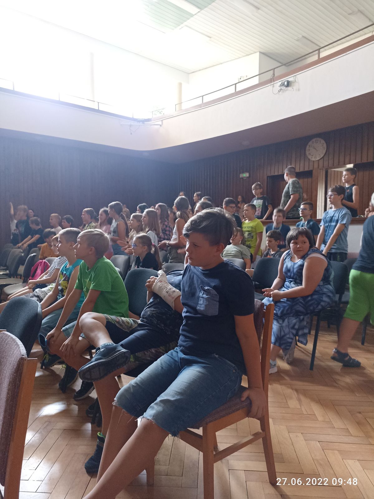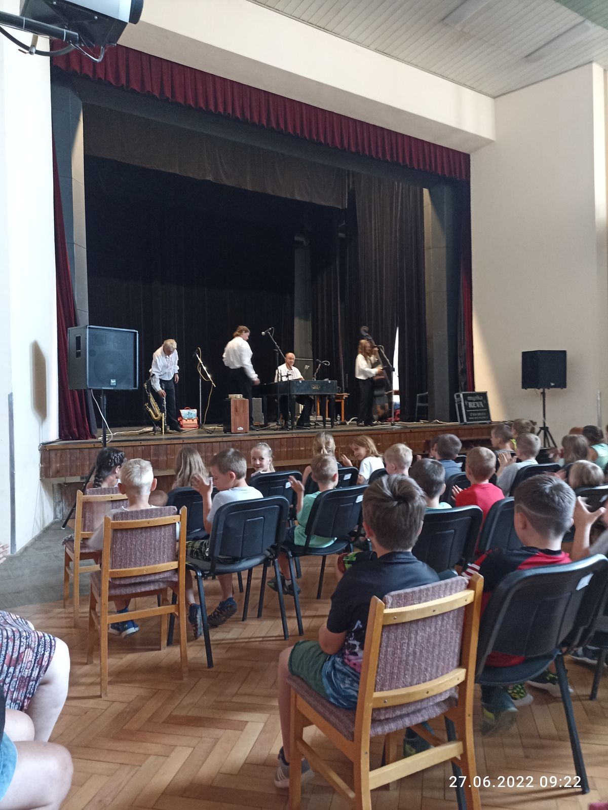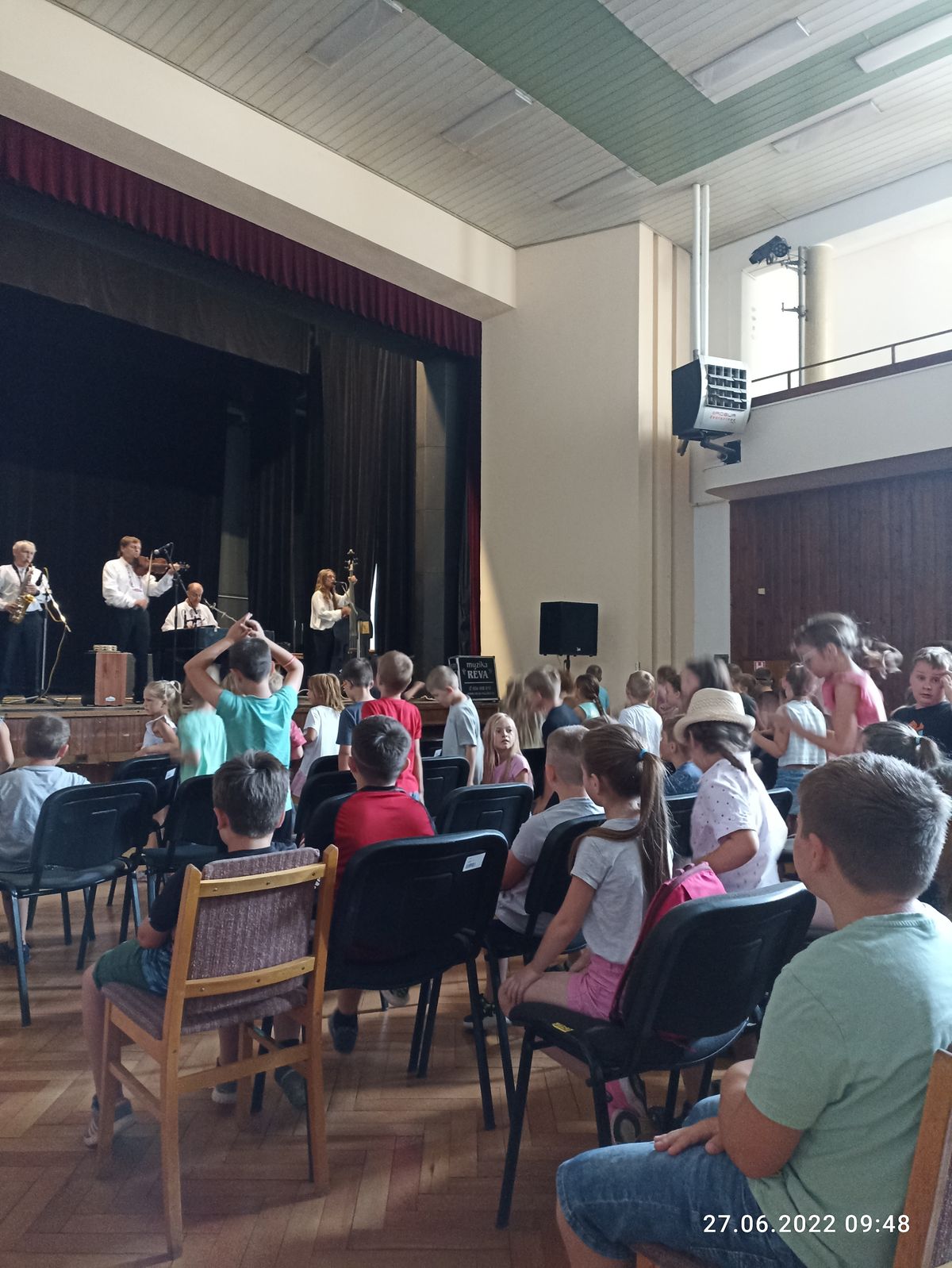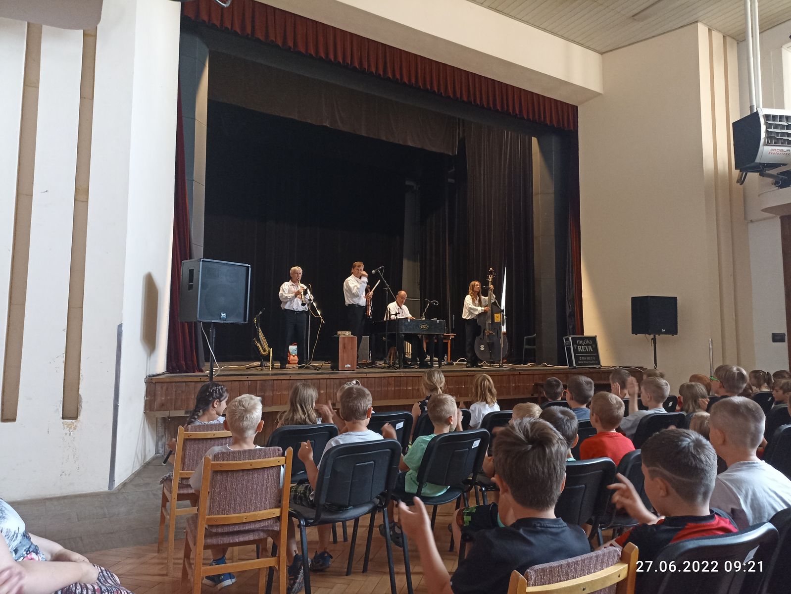 V pondělí 27. 6. 2022 přijela zazpívat a zahrát všem žákům školy cimbálová muzika Réva. Kapela vyvrátila žákům, že cimbál je pouze na hraní lidových písní, ale nádherně na něm zní i moderní muzika. Nejenže zapojili do programu žáky, ale některé paní učitelky nevydržely sedět v klidu a šly si zatancovat. V kulturním domě panovala příjemná nálada. Více ve fotogalerii