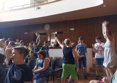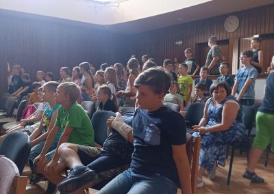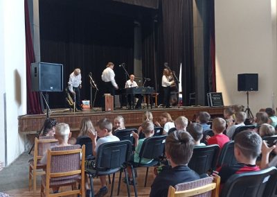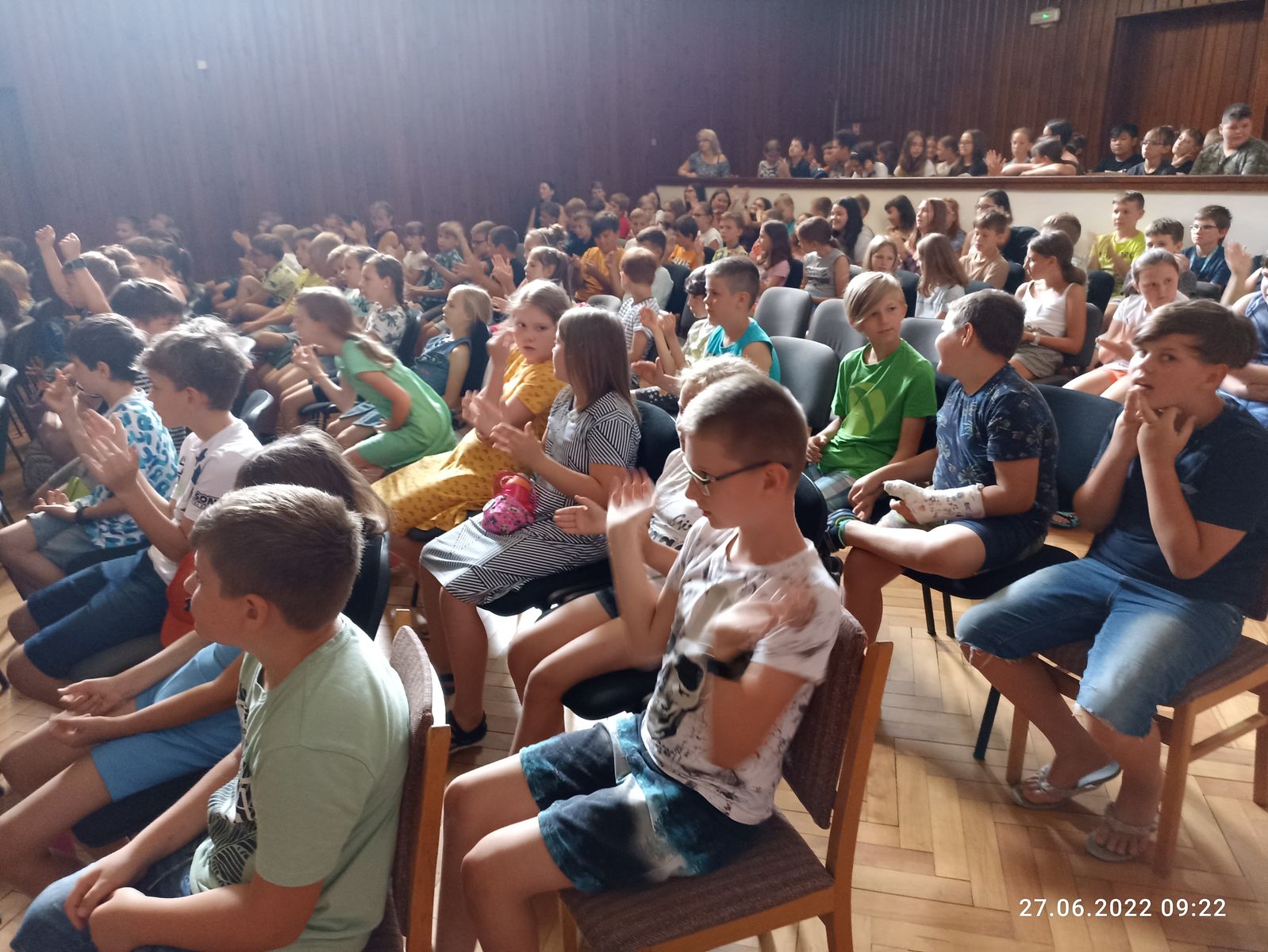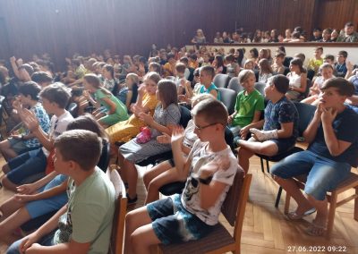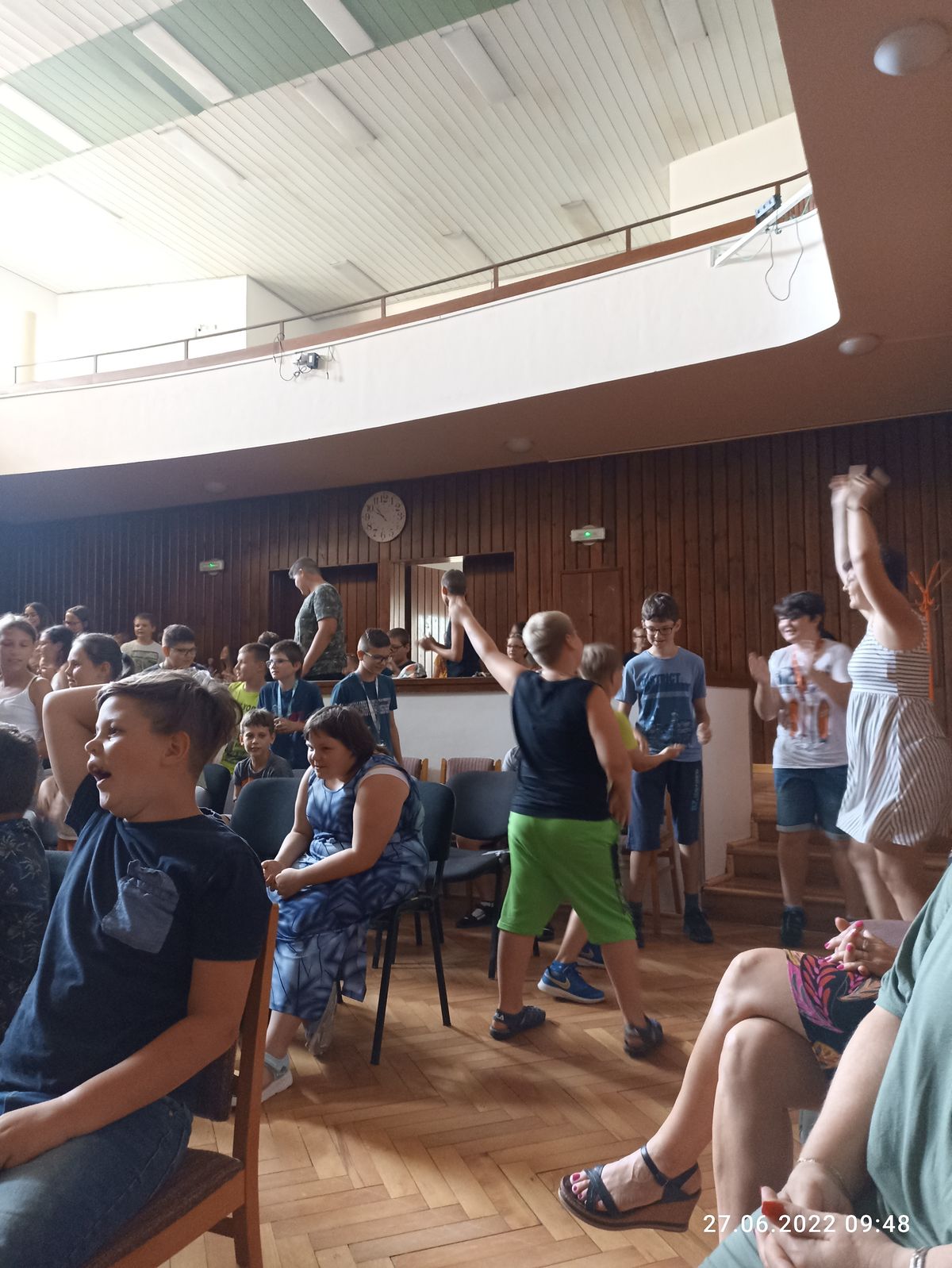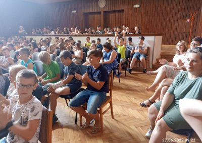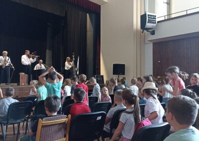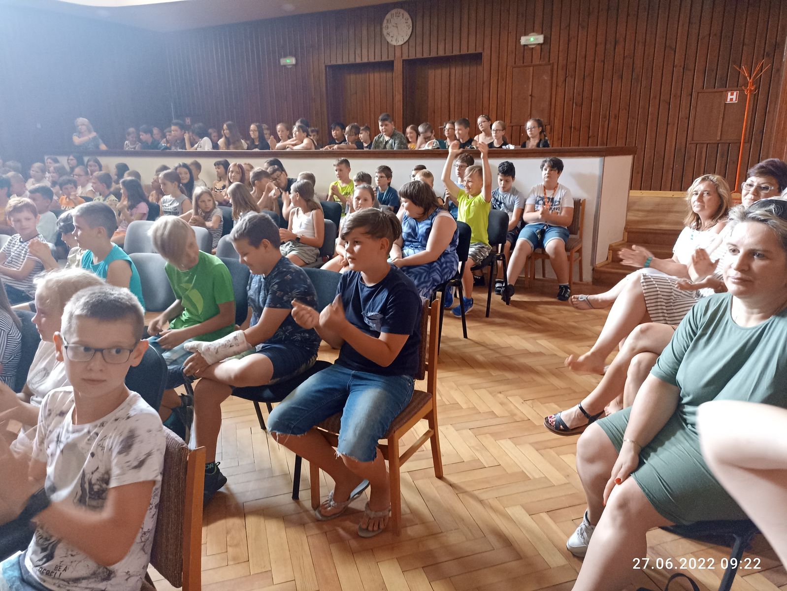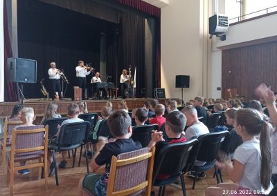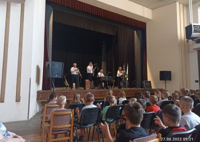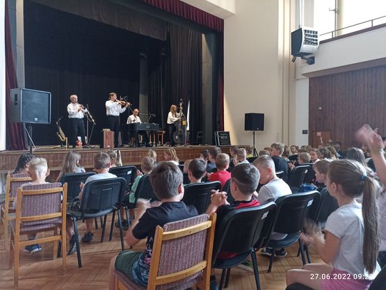 V pondělí 27. 6. 2022 přijela zazpívat a zahrát všem žákům školy cimbálová muzika Réva. Kapela vyvrátila žákům, že cimbál je pouze na hraní lidových písní, ale nádherně na něm zní i moderní muzika. Nejenže zapojili do programu žáky, ale některé paní učitelky nevydržely sedět v klidu a šly si zatancovat. V kulturním domě panovala příjemná nálada. Více ve fotogalerii
