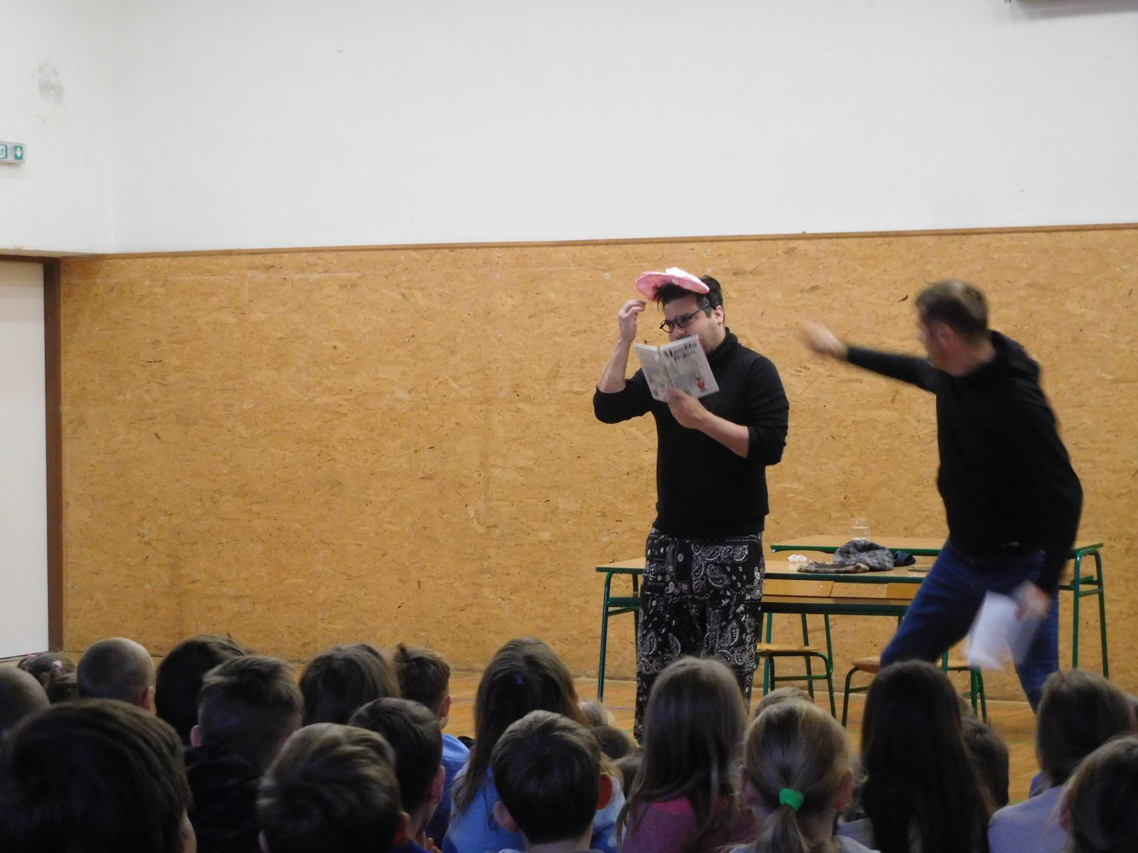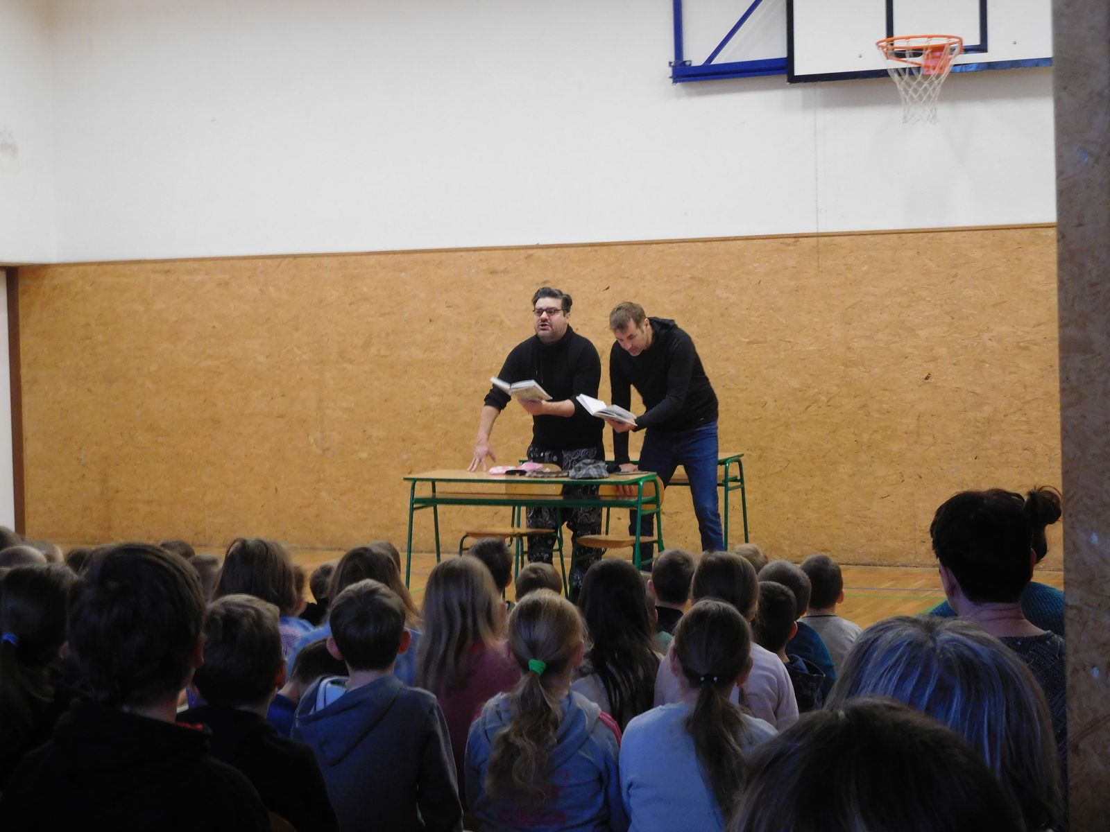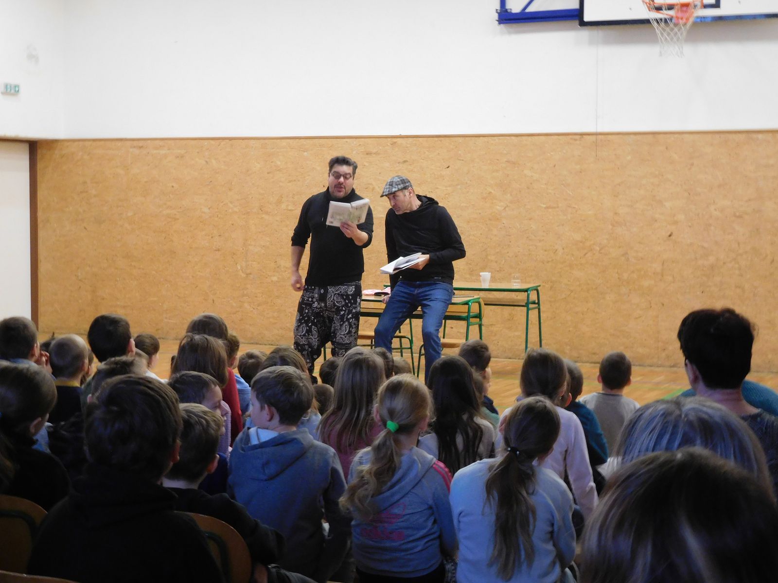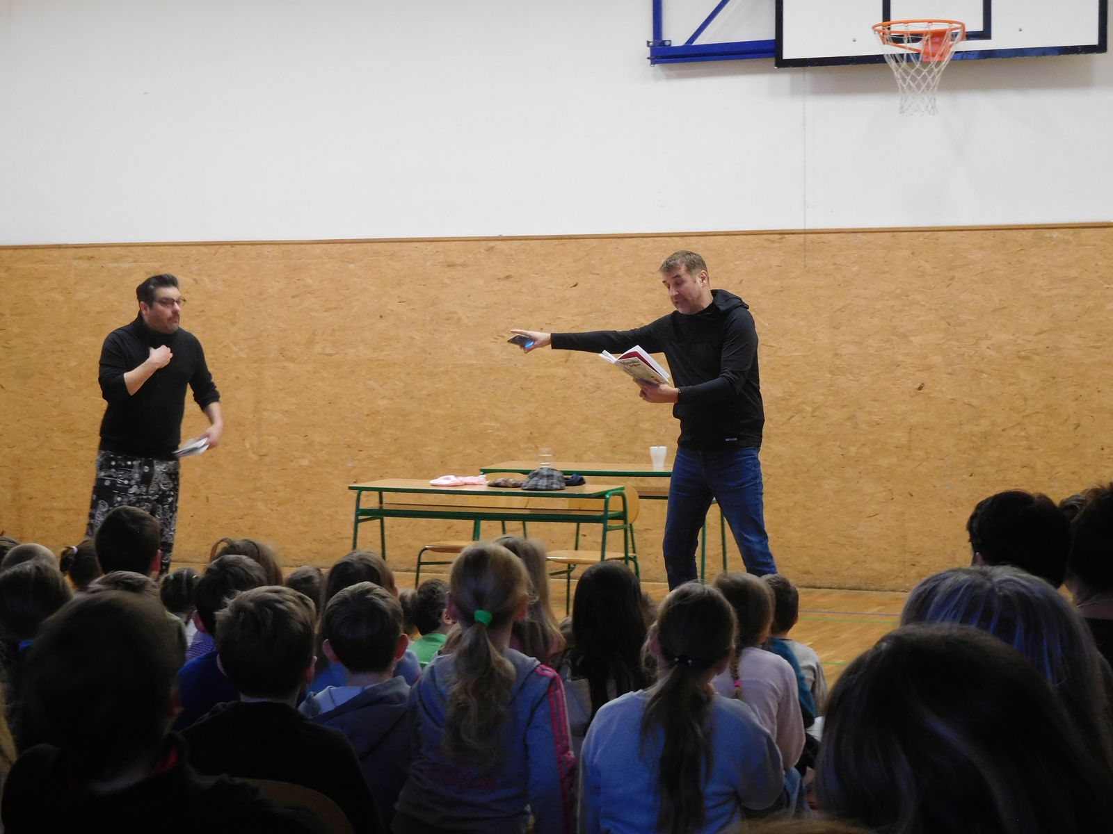 Mají žáci rádi knihy a čtení? To je otázka, kterou se v dnešní době zabývá spousta odborníků. A proto se snažíme, aby naši žáci vzali alespoň občas knihu na milost, ne za trest. V tom nám již několik let pomáhá samotné Listování. 6. února 2025 jsme měli možnost se s knihami v podání herců Městského divadla Brno opět potkat. Přijel k nám Alan Novotný spolu s Jiřím Resslerem, aby společně našim žákům představili dvě knihy. Každá z nich byla určena pro jednotlivý stupeň. Žáci I. stupně se seznámili s knihou MANOLITO BREJLOUN. Po celou dobu se nechávali unášet příběhem a spolupracovali s herci.