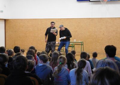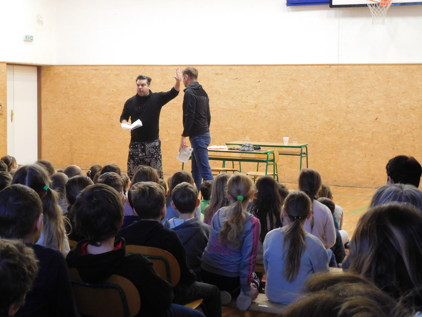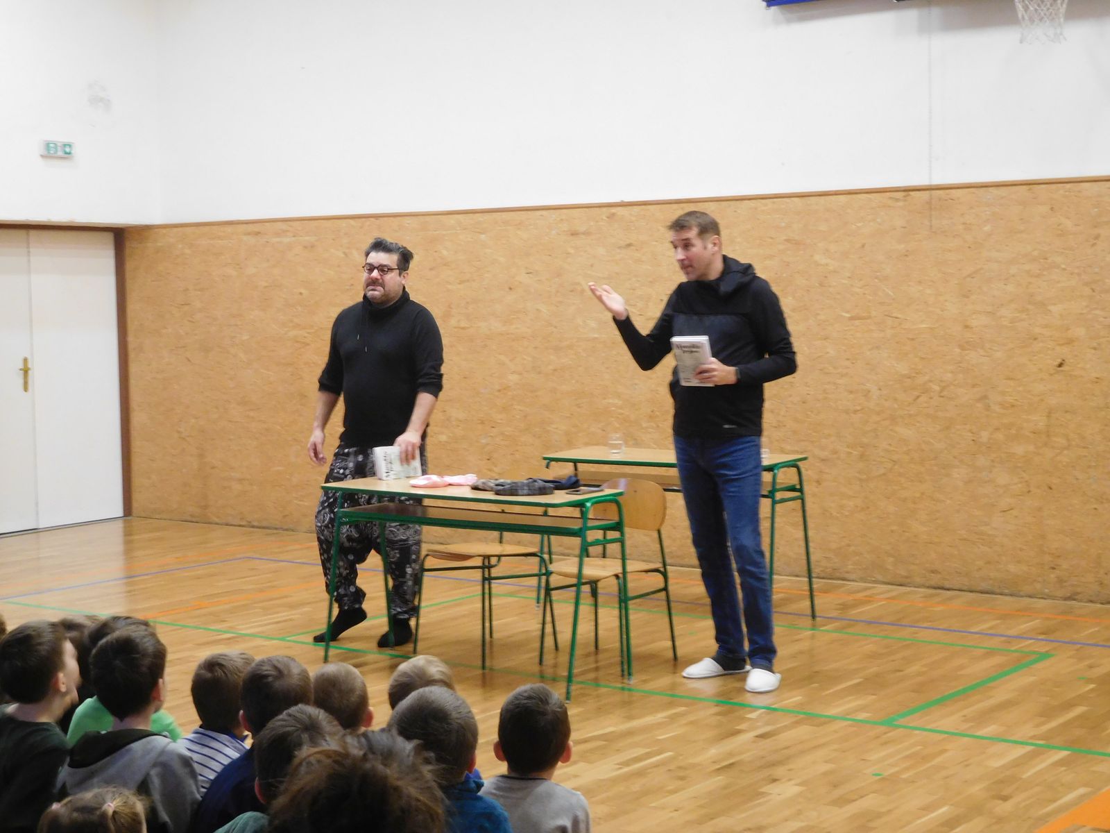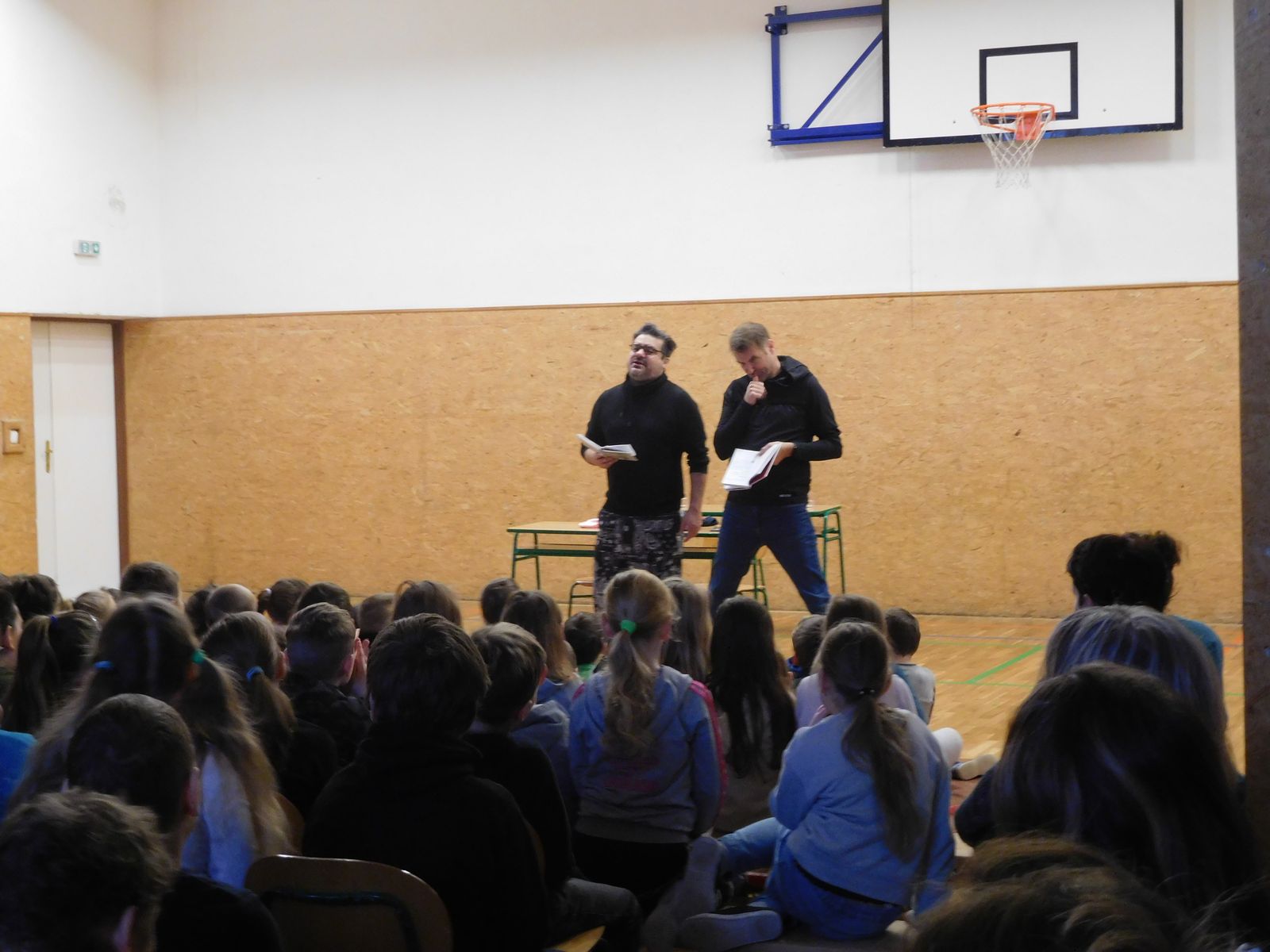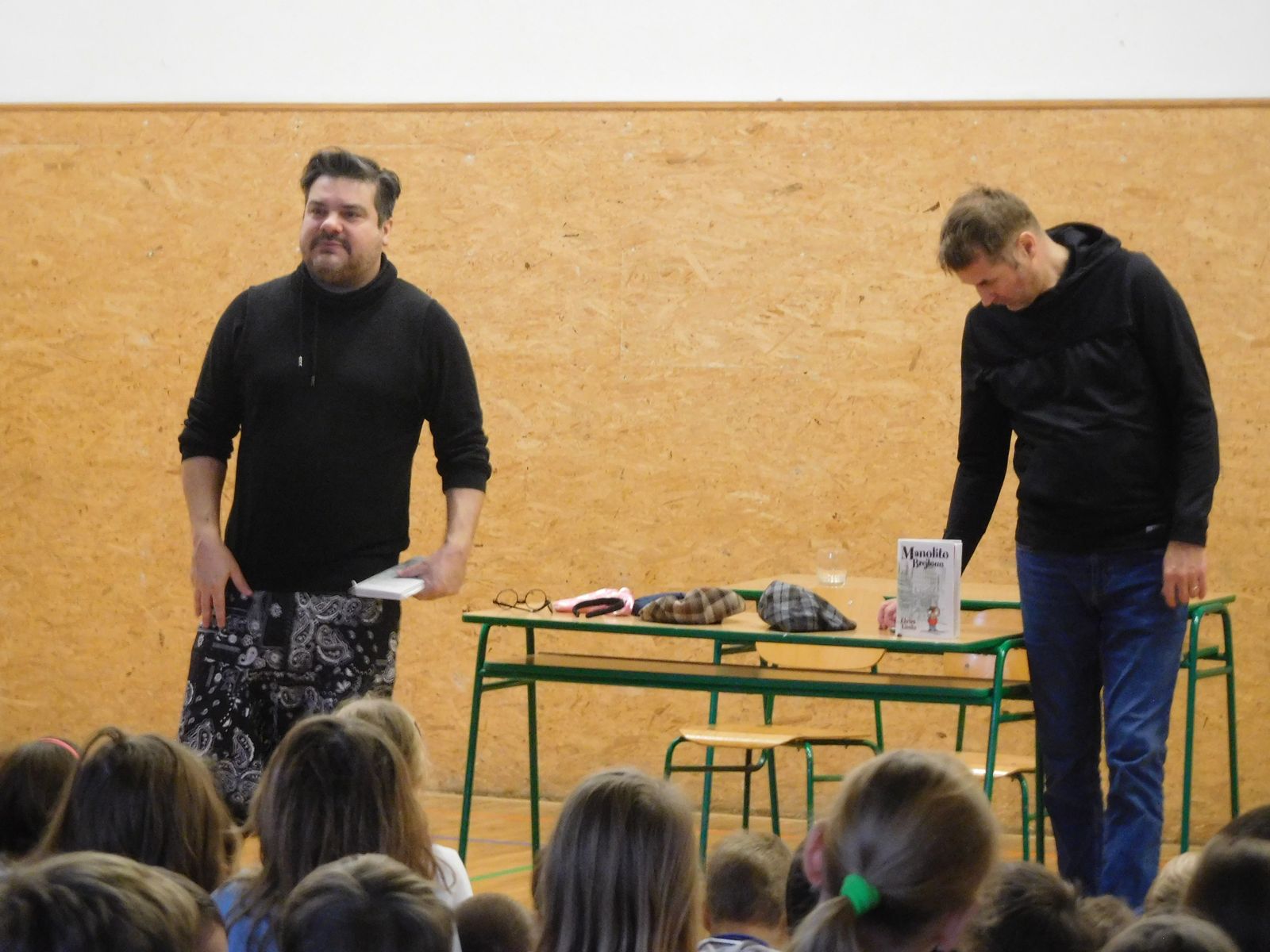 Mají žáci rádi knihy a čtení? To je otázka, kterou se v dnešní době zabývá spousta odborníků. A proto se snažíme, aby naši žáci vzali alespoň občas knihu na milost, ne za trest. V tom nám již několik let pomáhá samotné Listování. 6. února 2025 jsme měli možnost se s knihami v podání herců Městského divadla Brno opět potkat. Přijel k nám Alan Novotný spolu s Jiřím Resslerem, aby společně našim žákům představili dvě knihy. Každá z nich byla určena pro jednotlivý stupeň. Žáci I. stupně se seznámili s knihou MANOLITO BREJLOUN. Po celou dobu se nechávali unášet příběhem a spolupracovali s herci.