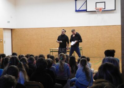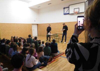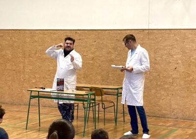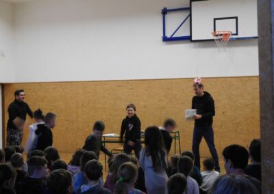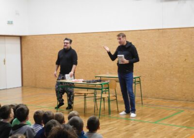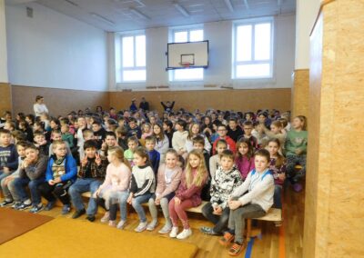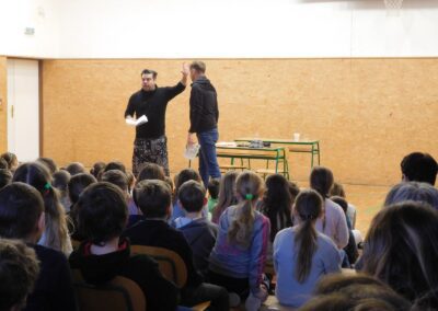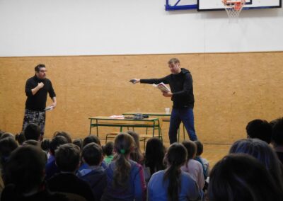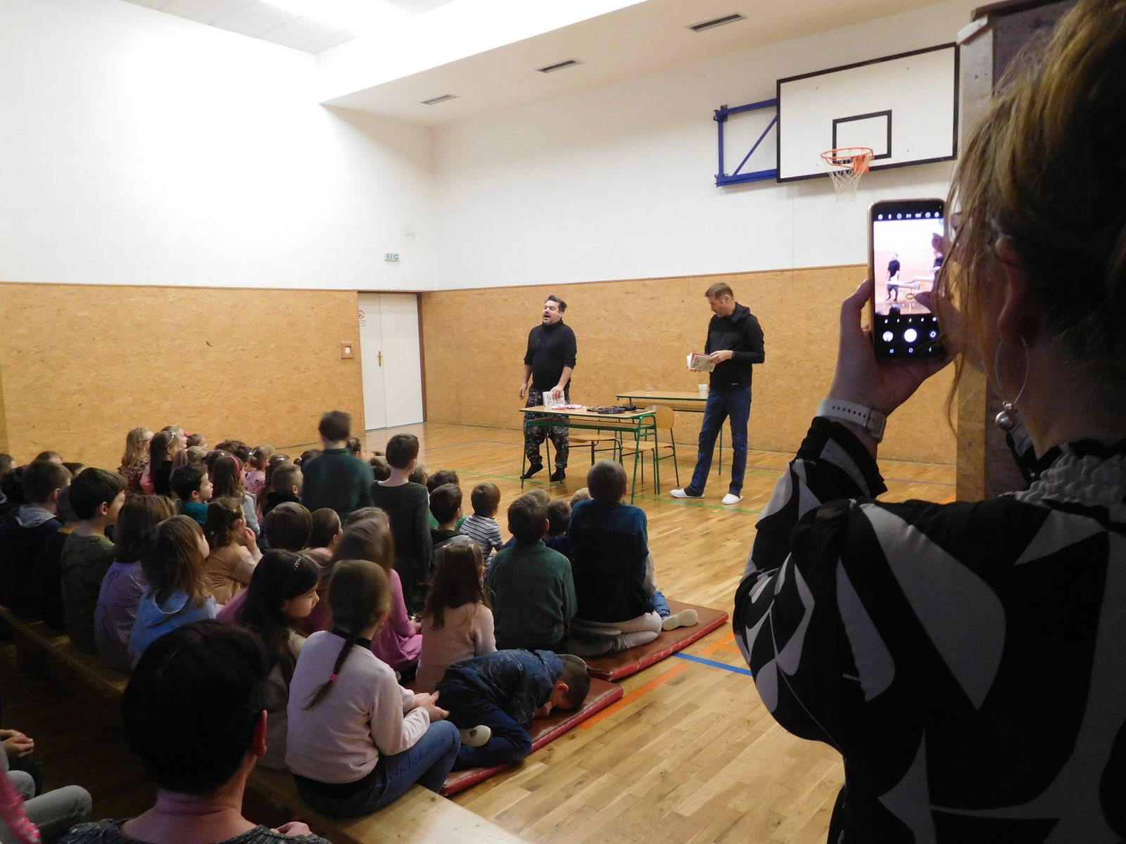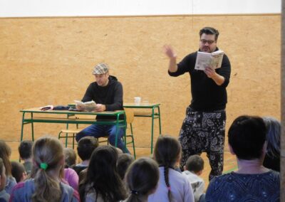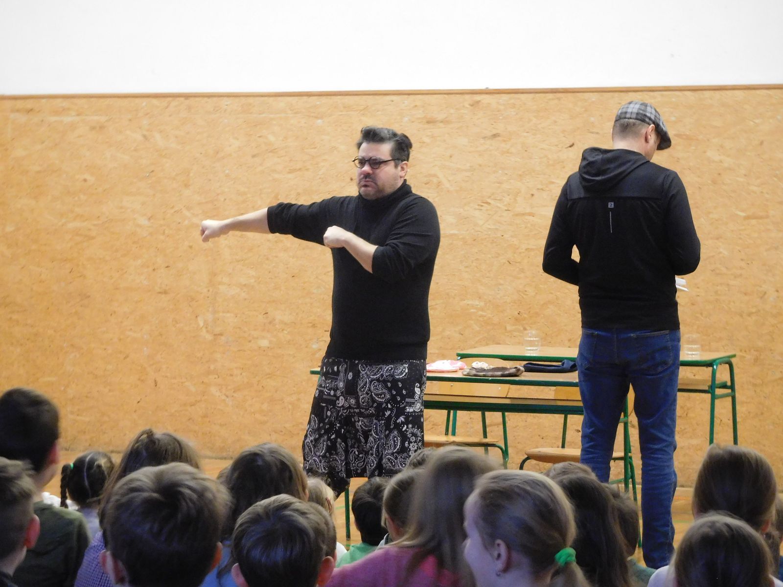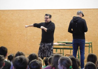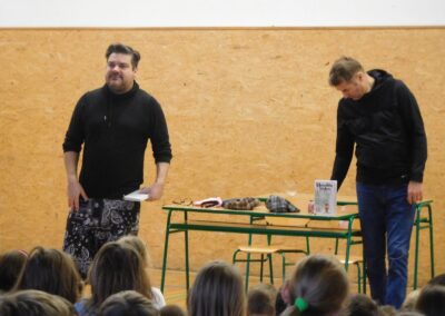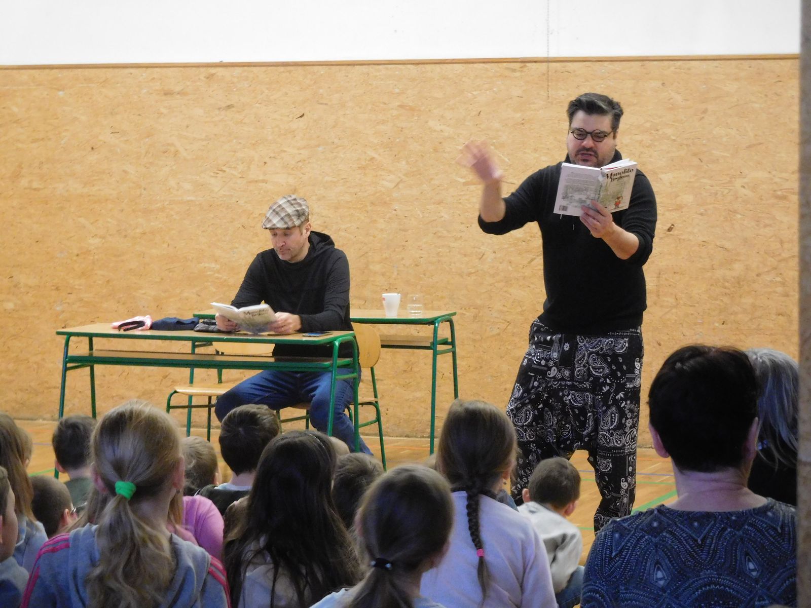 Mají žáci rádi knihy a čtení? To je otázka, kterou se v dnešní době zabývá spousta odborníků. A proto se snažíme, aby naši žáci vzali alespoň občas knihu na milost, ne za trest. V tom nám již několik let pomáhá samotné Listování. 6. února 2025 jsme měli možnost se s knihami v podání herců Městského divadla Brno opět potkat. Přijel k nám Alan Novotný spolu s Jiřím Resslerem, aby společně našim žákům představili dvě knihy. Každá z nich byla určena pro jednotlivý stupeň. Žáci I. stupně se seznámili s knihou MANOLITO BREJLOUN. Po celou dobu se nechávali unášet příběhem a spolupracovali s herci.
