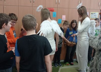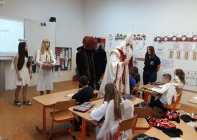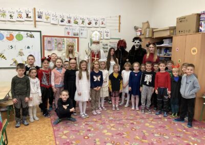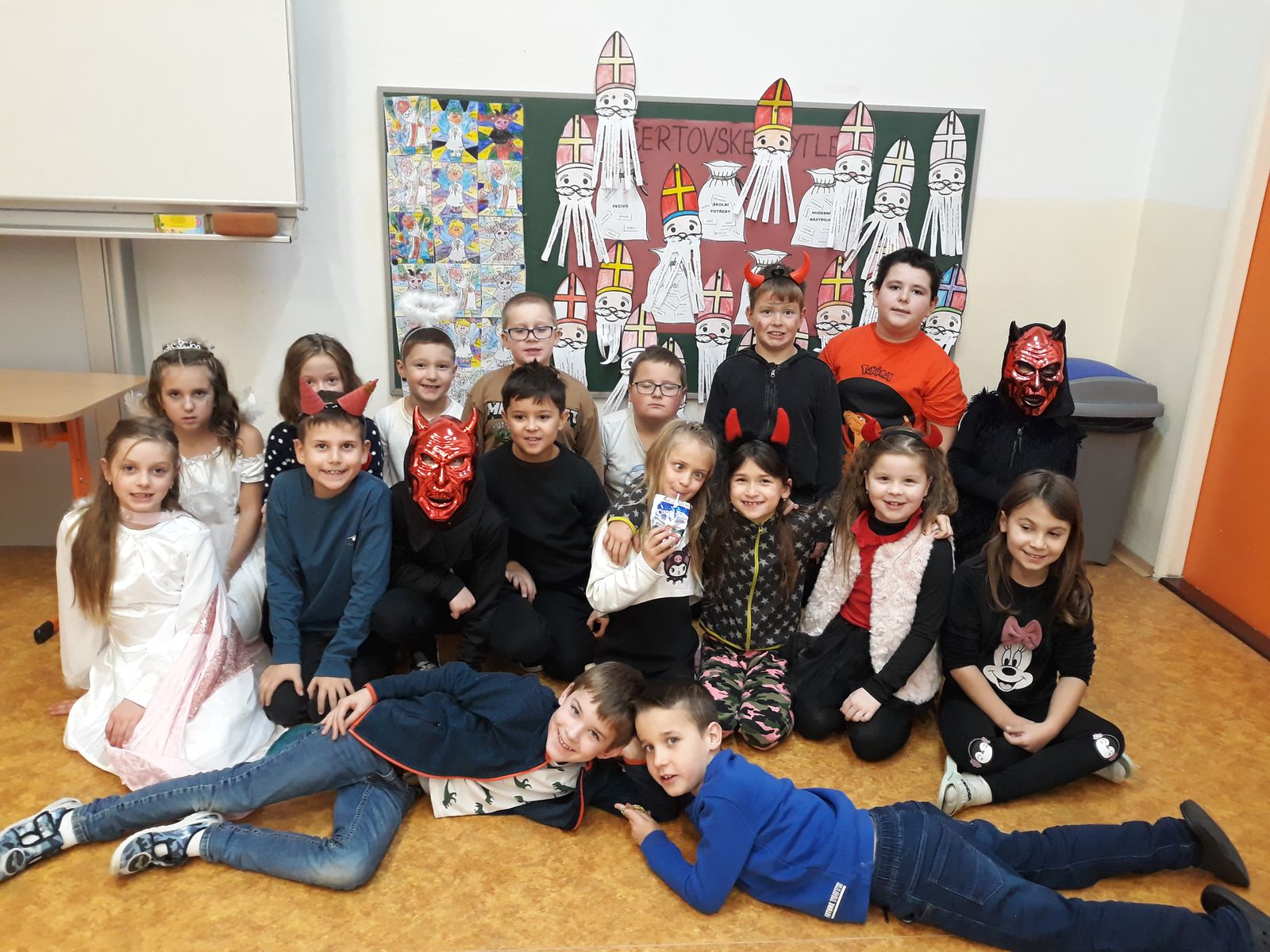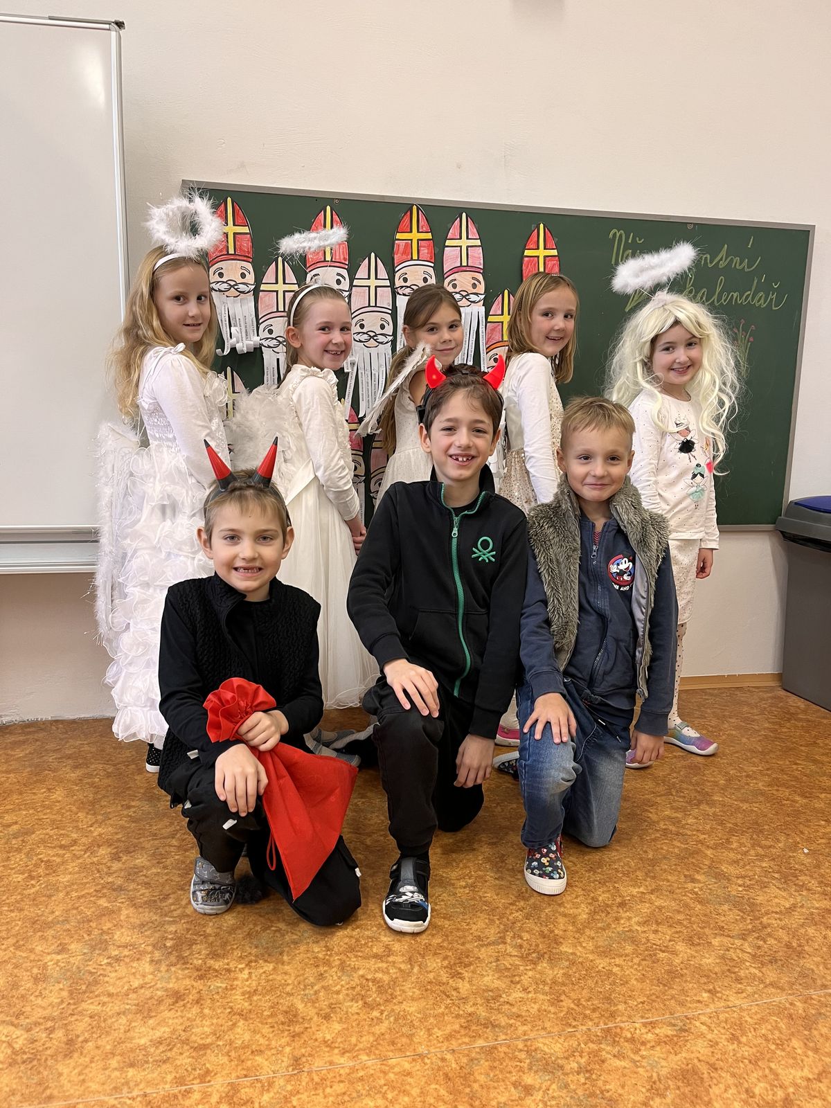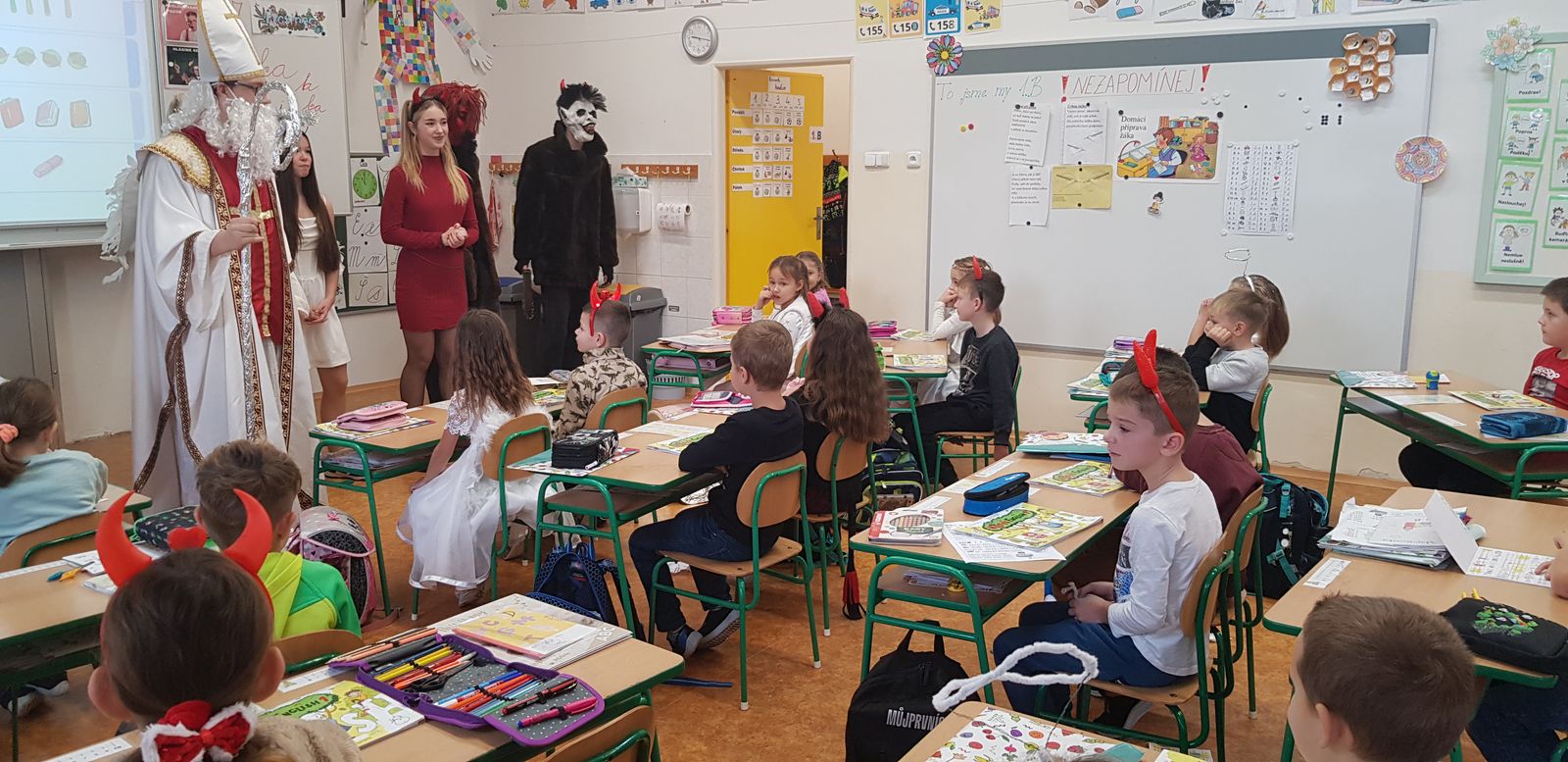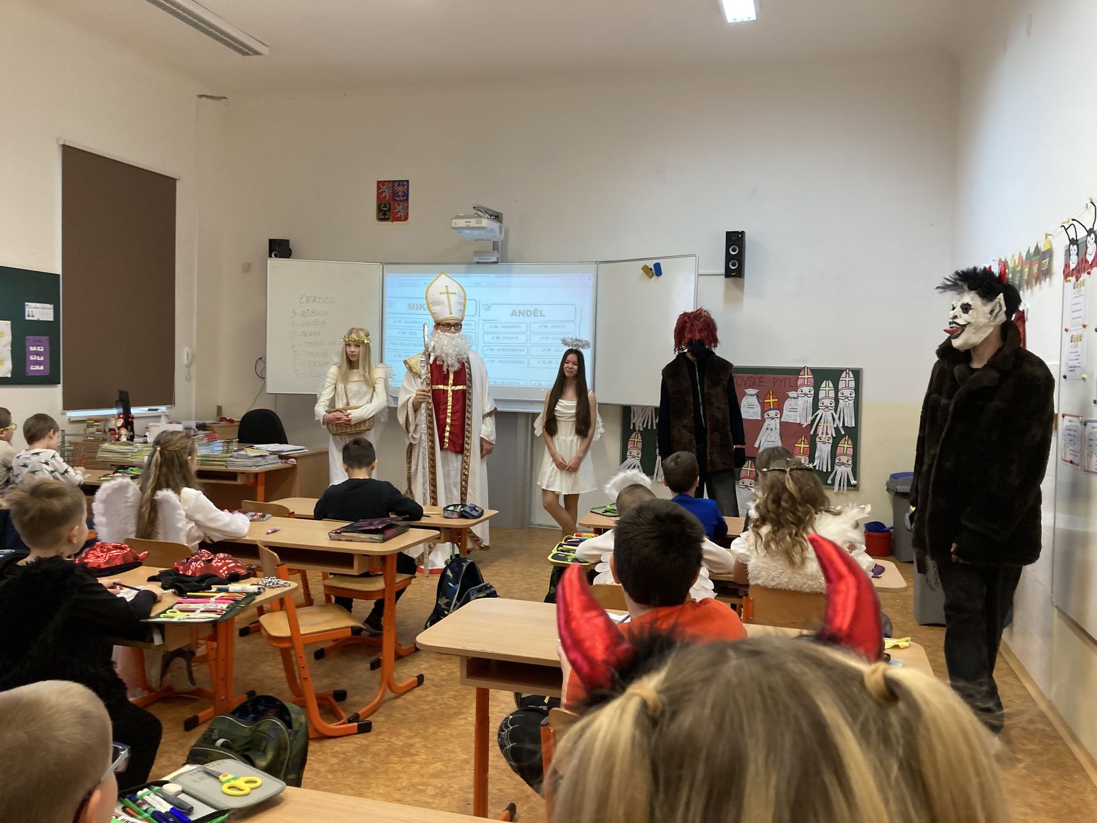 Ve čtvrtek 5. prosince všechny děti čekaly a přemýšlely o tom, jestli na Barborku přijde Mikuláš se svou družinou – andělem a čerty. A dočkaly se. Mikuláš nezapomněl s sebou vzít Knihu hříchů, čertíci pytle na neposedné děti a tichými krůčky doprovázeli družinu usmívající se andělé. Na dětech byla vidět zvídavost, radost, ale některé se také trošku bály. Naštěstí patří většina dětí naší školy mezi ty vzorné, takže strašení peklem nebylo nutné. Ti, kteří občas zazlobí, slíbily, že se polepší, a ty hodné přísahaly, že budou ještě hodnější. Všechny se tak nakonec dočkaly i nadílky od andělů.