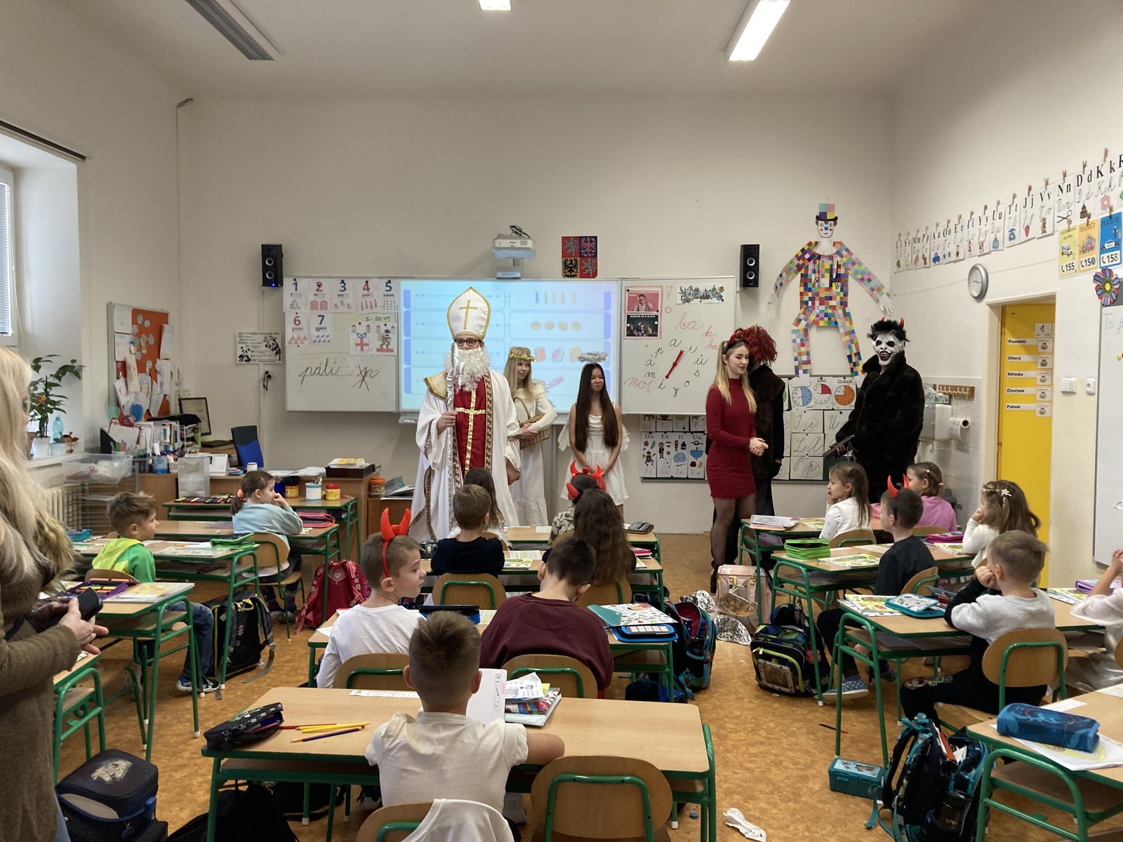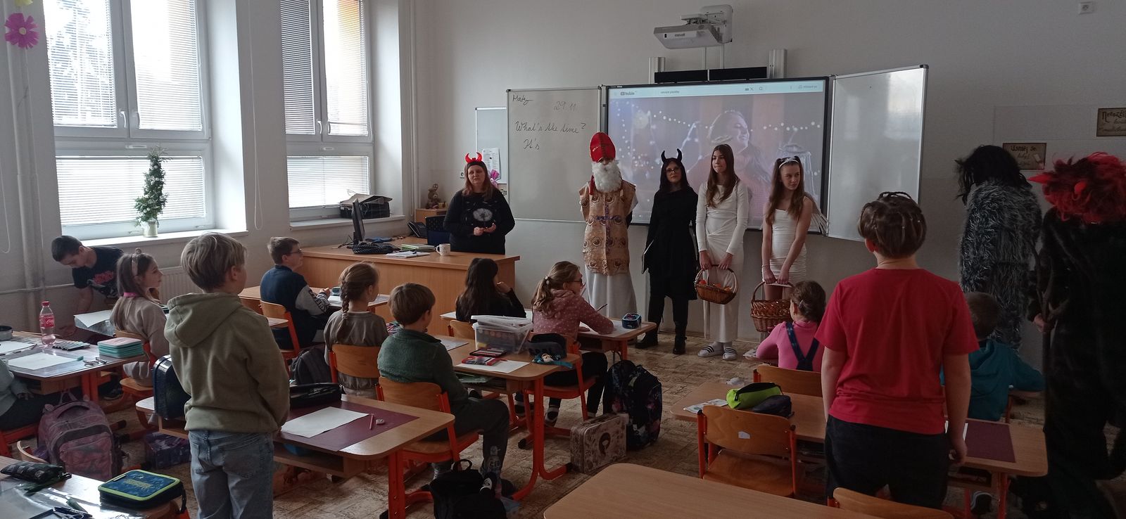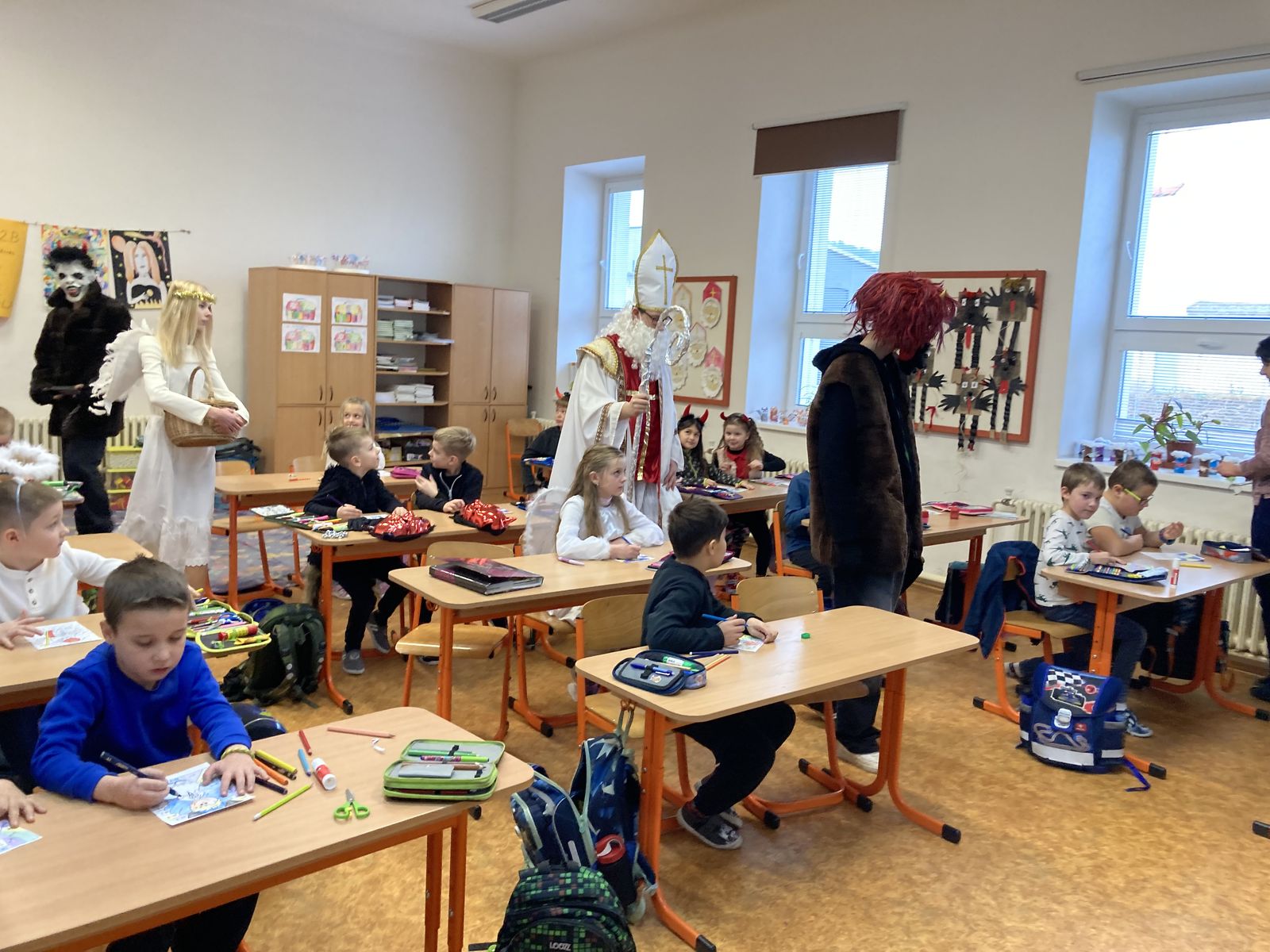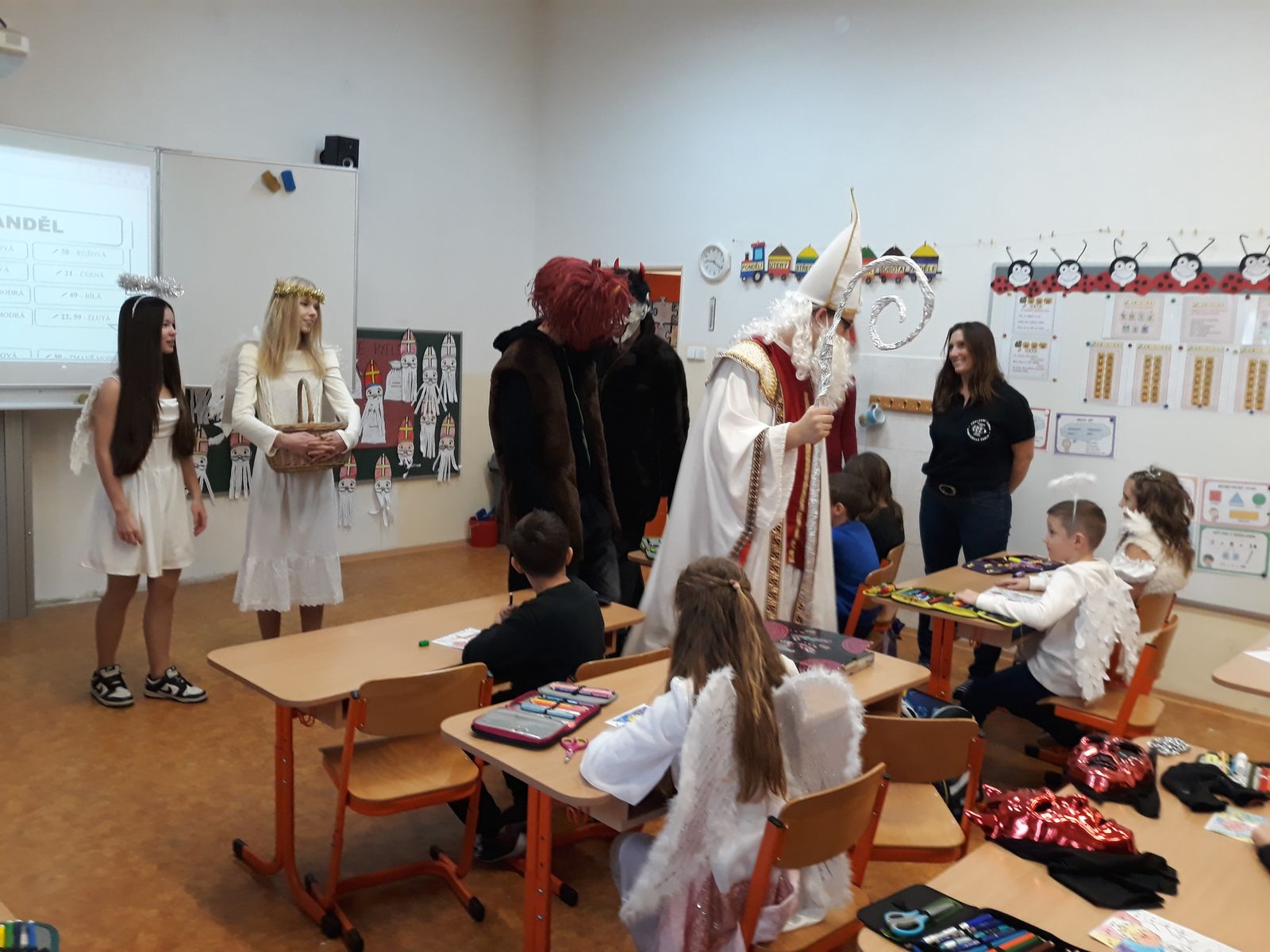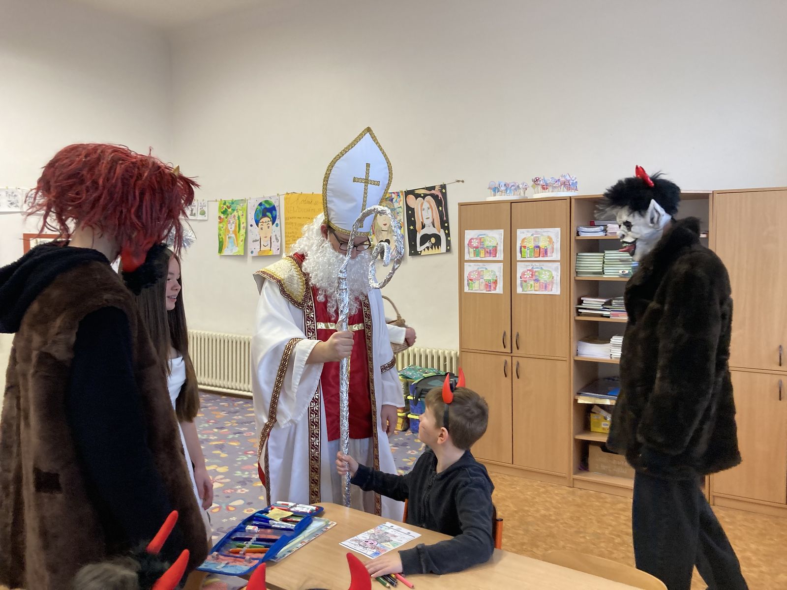 Mikuláš se svou družinou prošel třídy menších dětí také v hlavní budově na ulici Smetanova, nezapomněl ani na mateřskou školu.