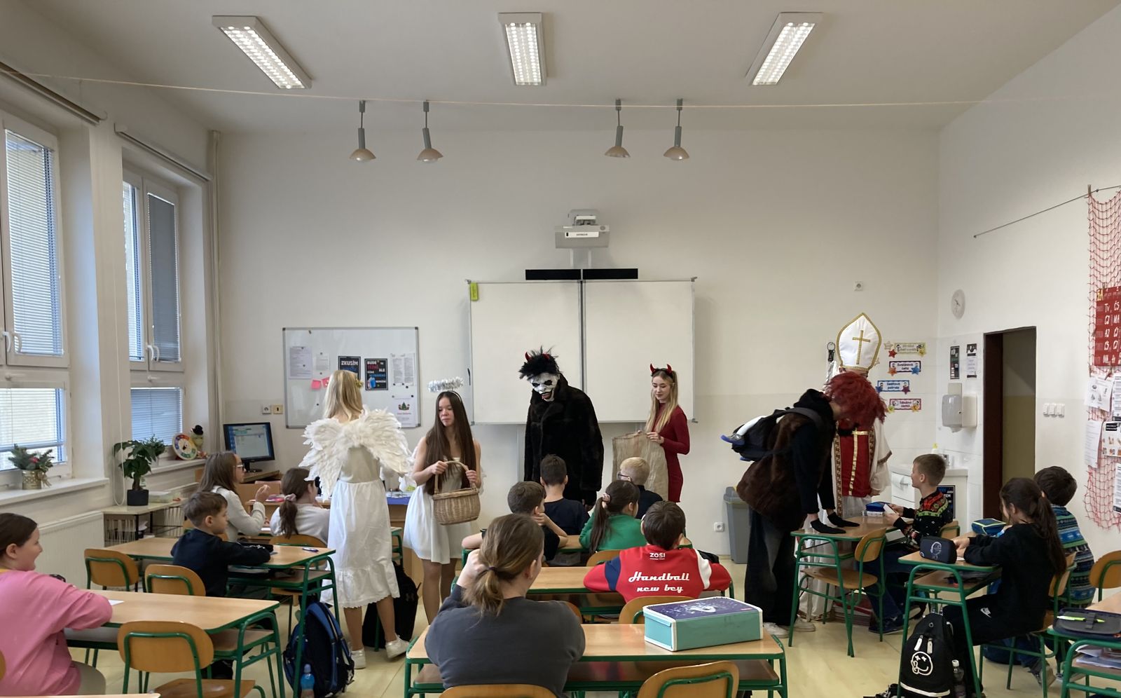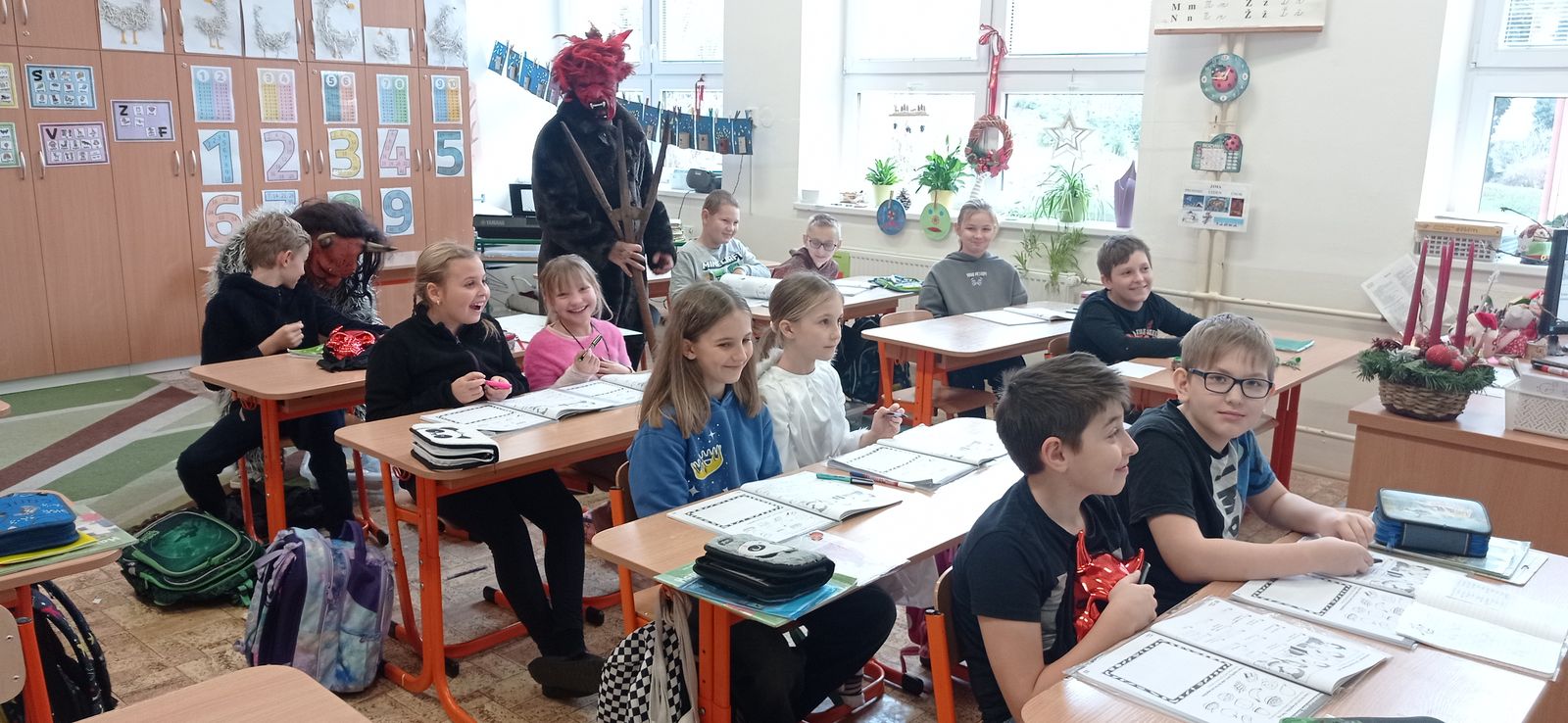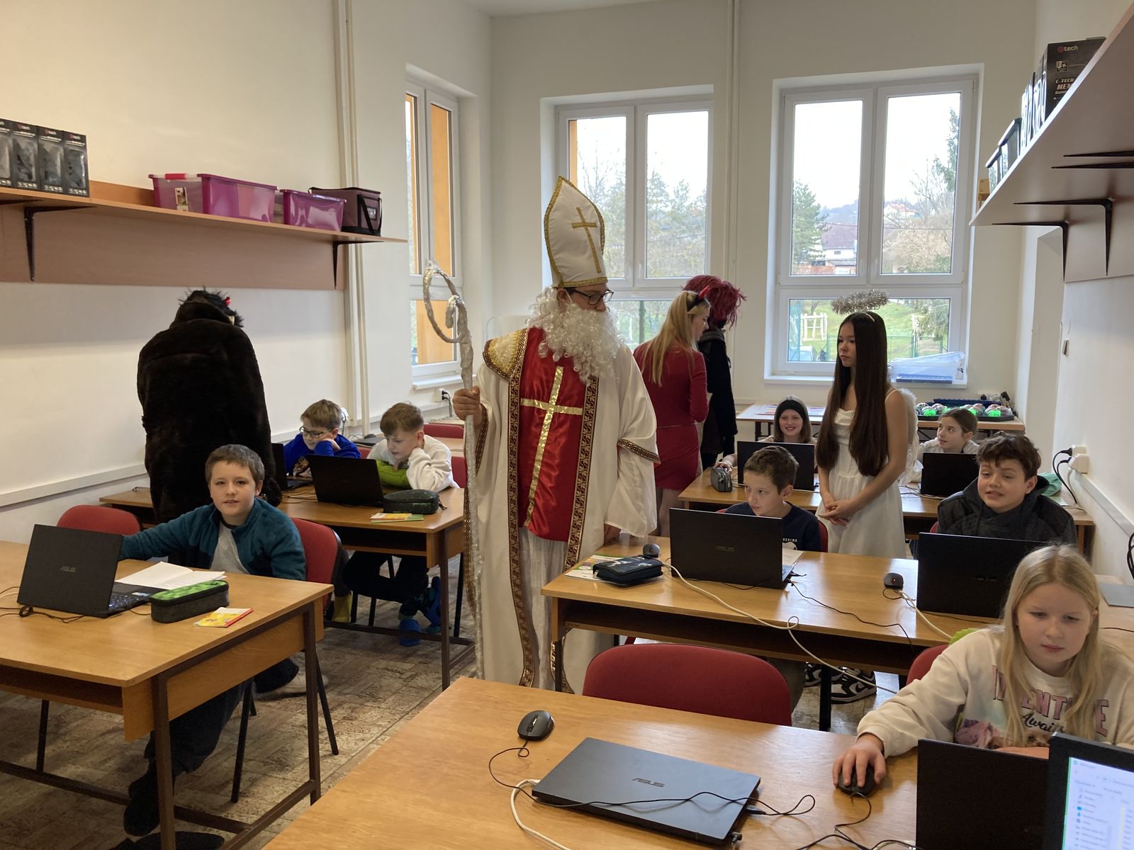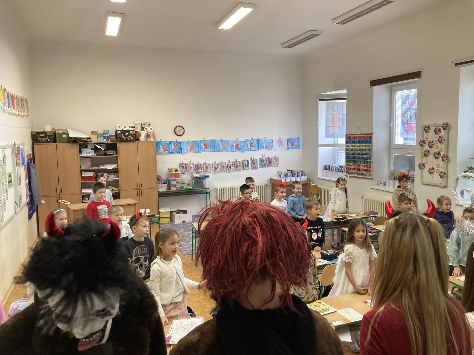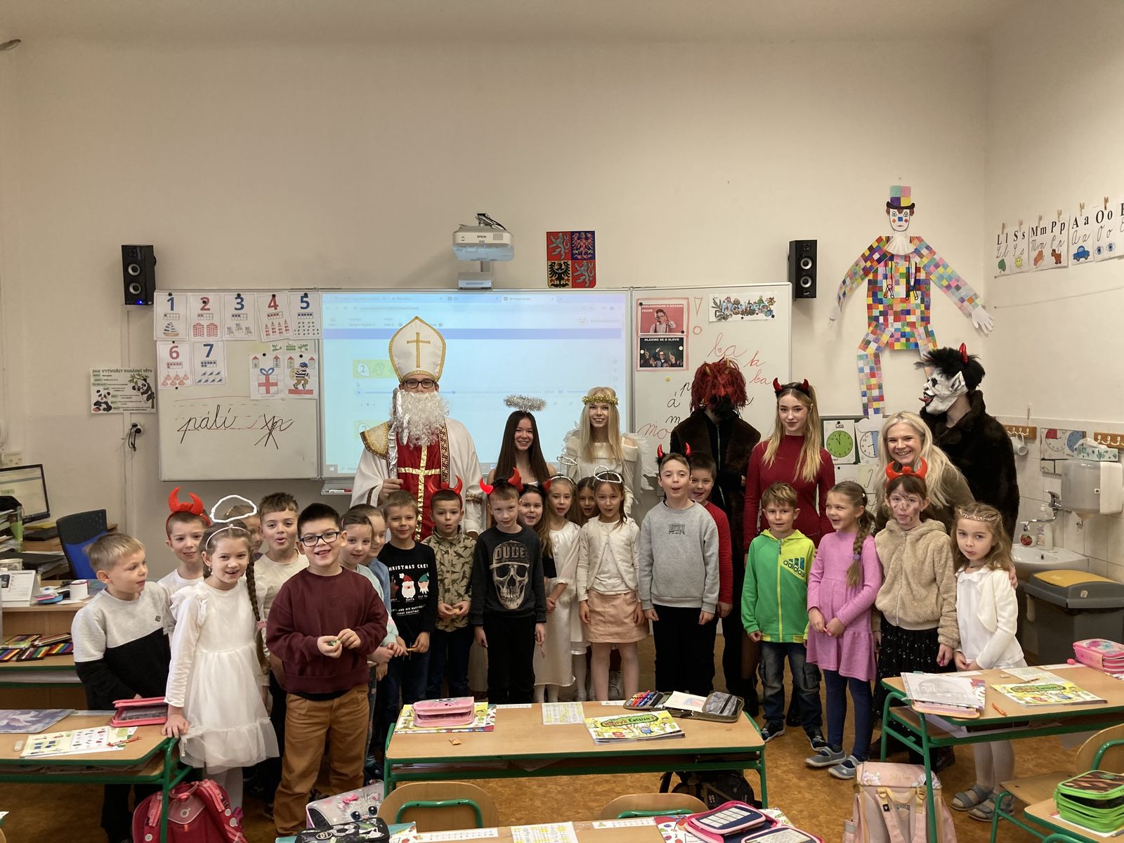 Mikuláš se svou družinou prošel třídy menších dětí také v hlavní budově na ulici Smetanova, nezapomněl ani na mateřskou školu.