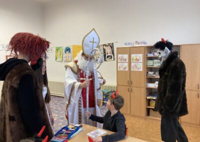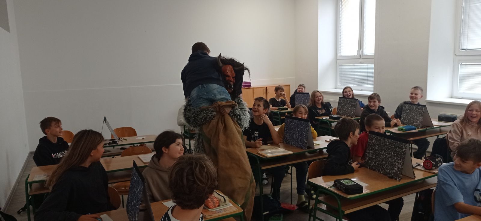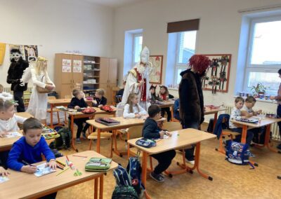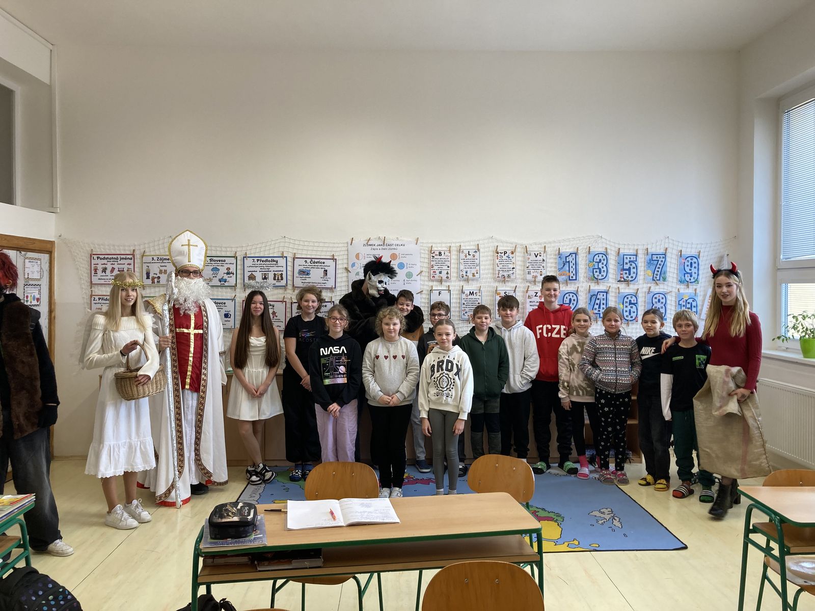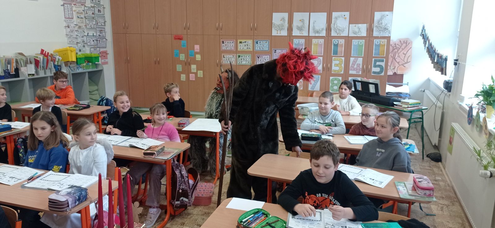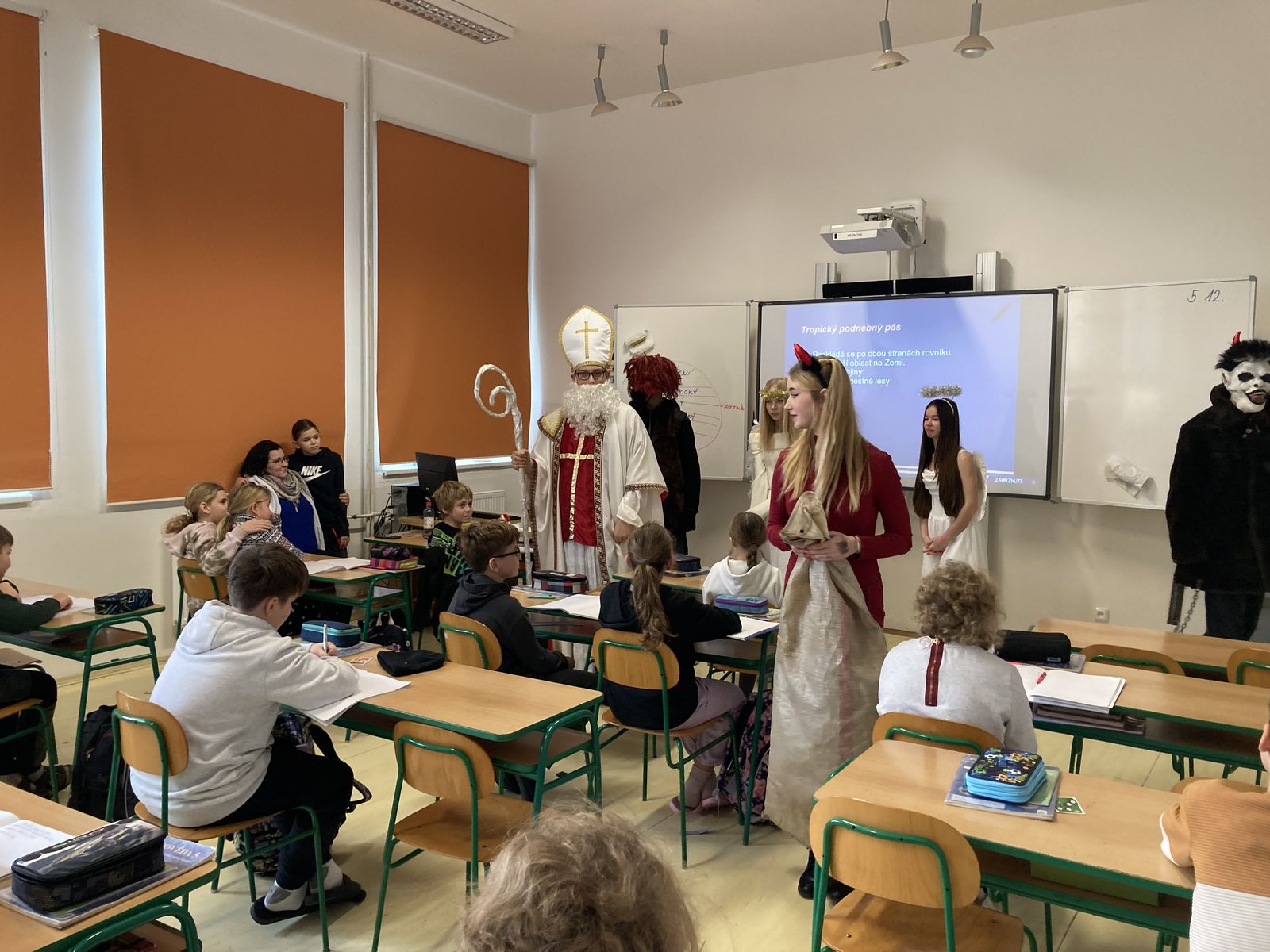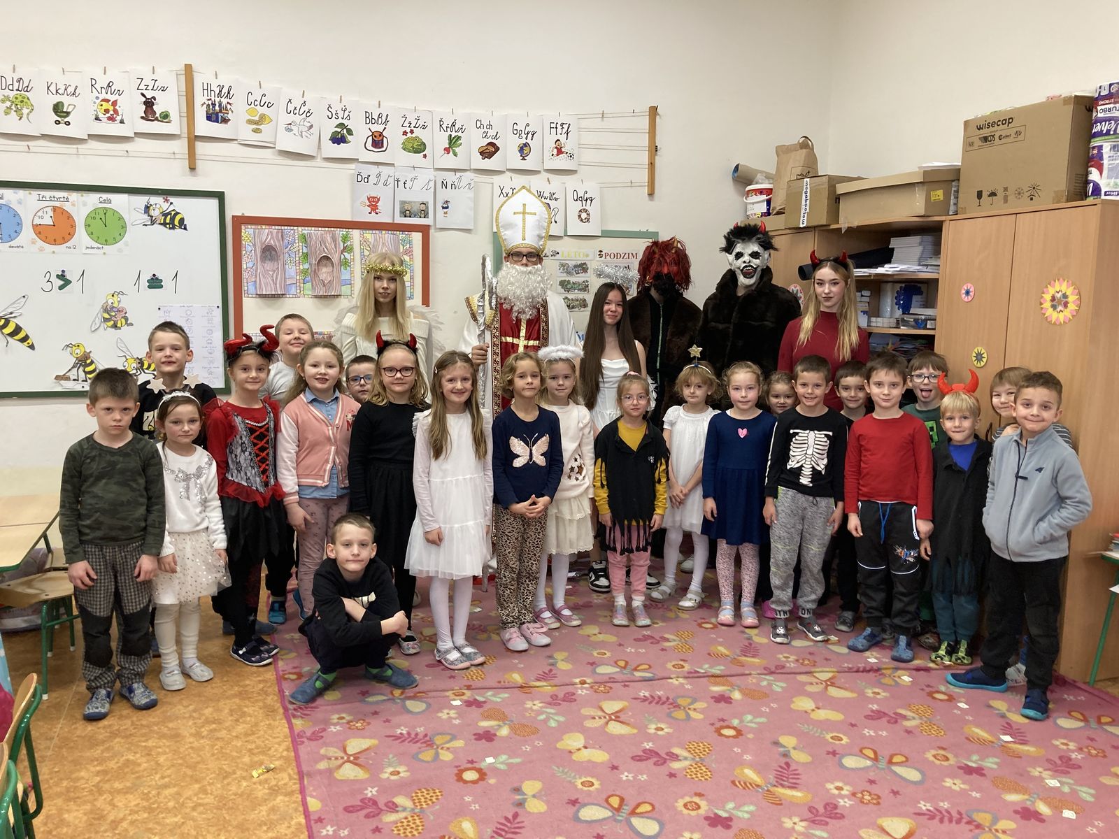 Mikuláš se svou družinou prošel třídy menších dětí také v hlavní budově na ulici Smetanova, nezapomněl ani na mateřskou školu.