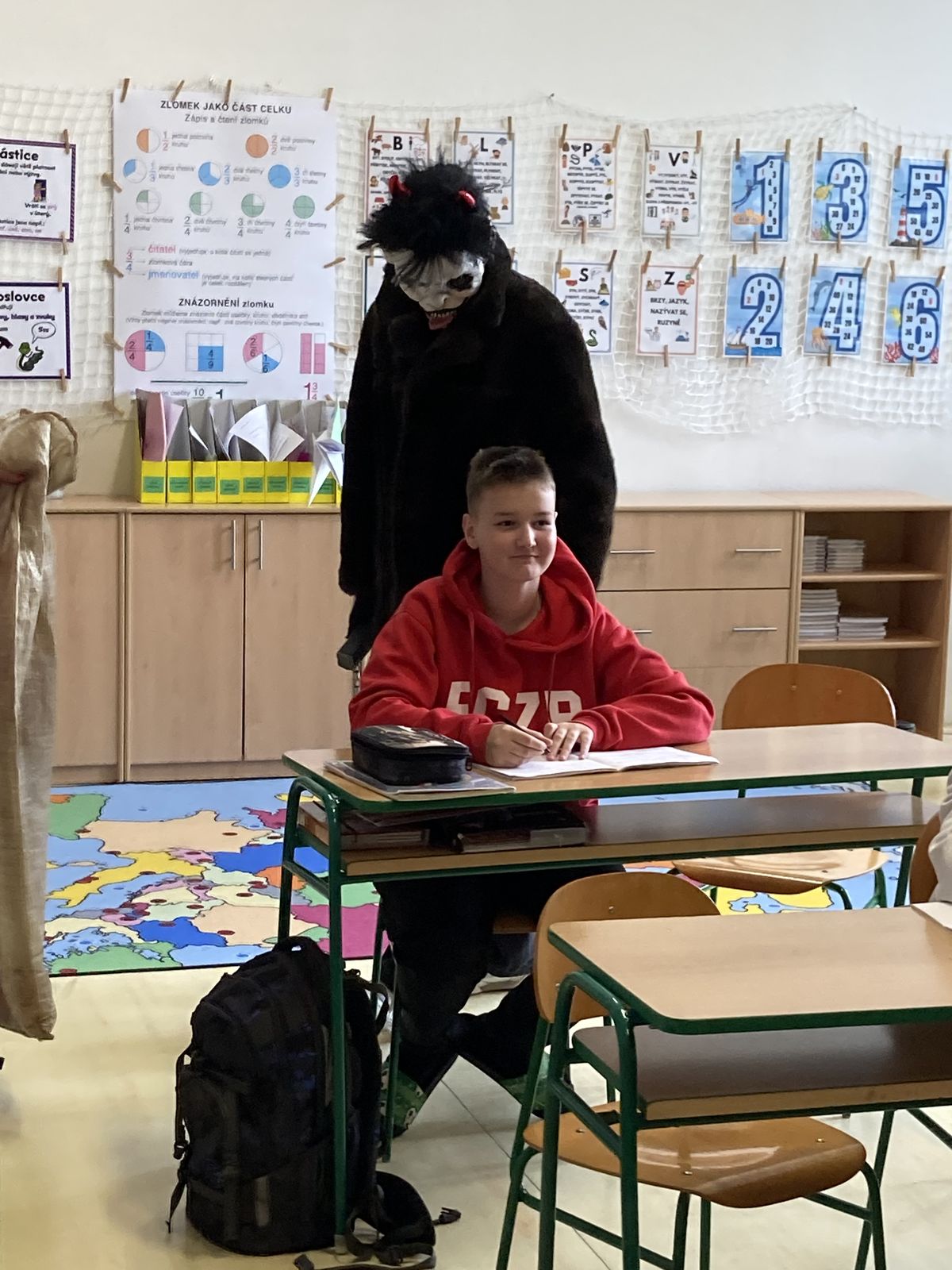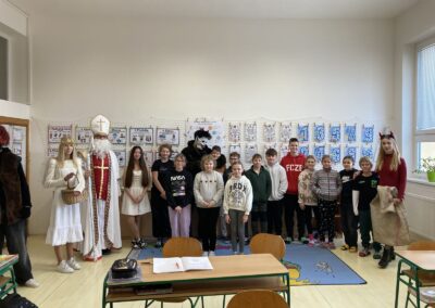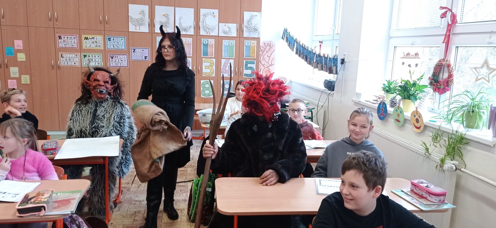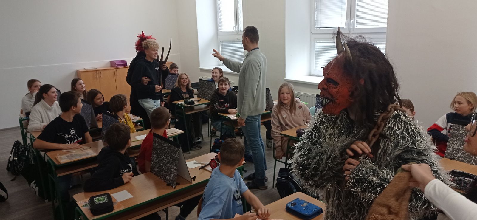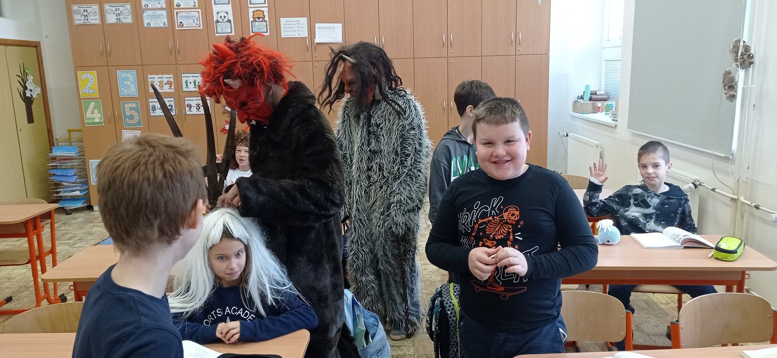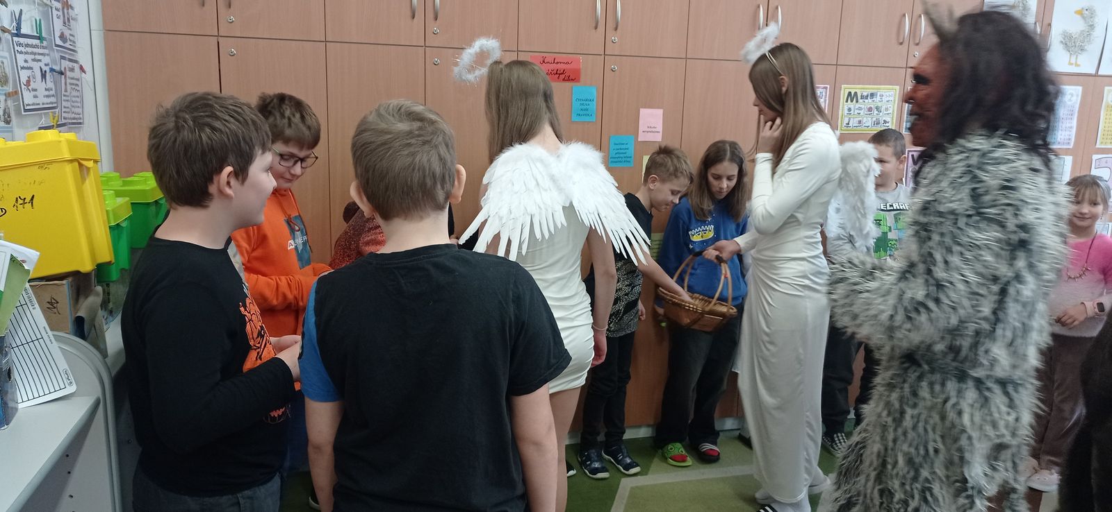 Mikuláš se svou družinou prošel třídy menších dětí také v hlavní budově na ulici Smetanova, nezapomněl ani na mateřskou školu.