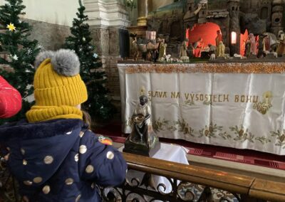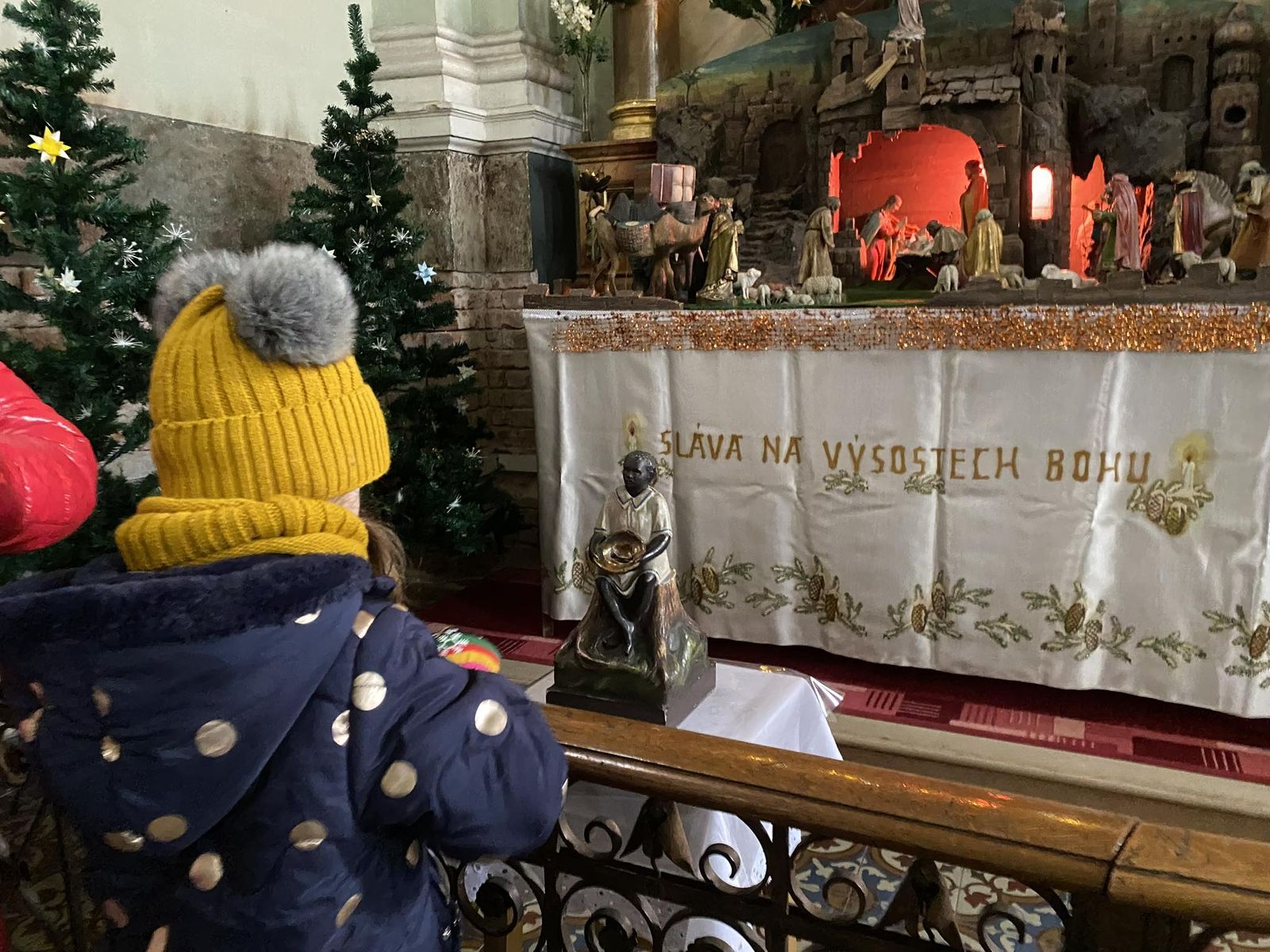 U kostela nás přivítal pan farář, který nám ukázal betlémy a zazpíval koledy.