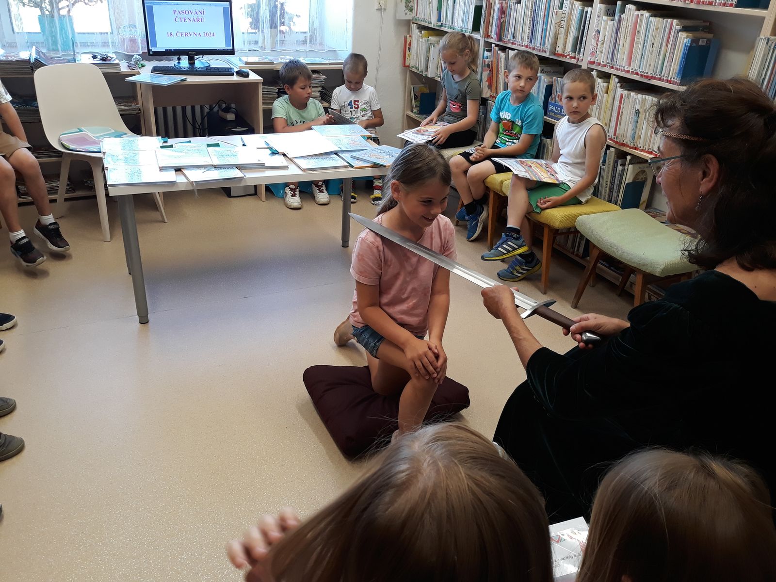 V městské knihovně nás přivítala paní knihovnice Jana Káčerková, seznámila nás s uspořádáním knihovny, kde jakou knihu najdeme a také jak s nimi správně zacházet. Každý žák přečetl úryvek z pohádky, tím na vlastní oči předvedl, že se právem stává čtenářem. Poté co složili čtenářský slib, byli královnou pasováni do Řádu čtenářského. Na památku této významné události děti obdržely pasovací listinu a knihu Kouzelné brýle z projektu Knížka pro prvňáčka vydanou speciálně k tomuto účelu.