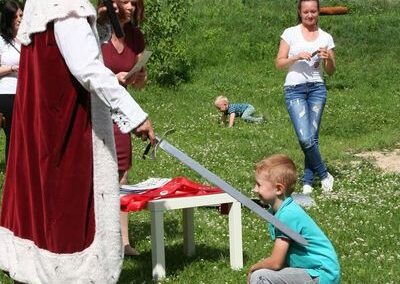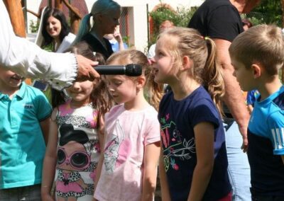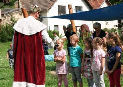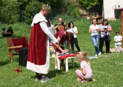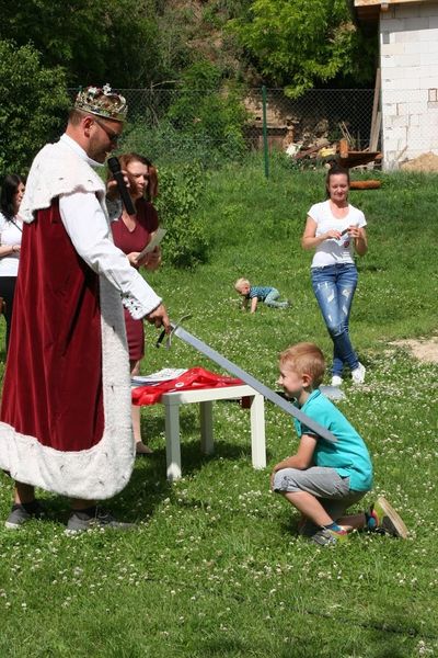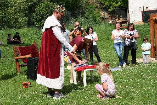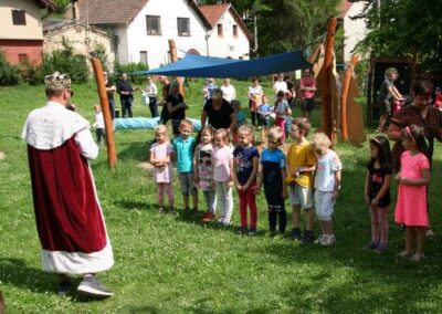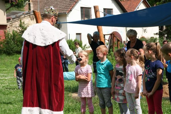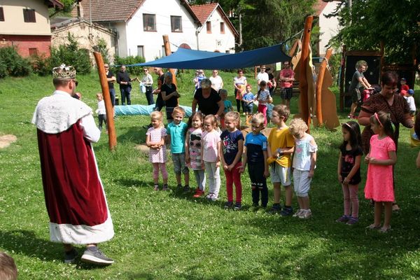 Nastal slavnostní okamžik, na který se všichni těšili. Pan Král pasoval předškoláky na školáky krásným mečem. Paní učitelky předaly dětem šerpy, knížku s věnováním a pamětní list. Potom už se mohla rozjet zábava! Pro děti bylo připraveno 5 stanovišť, na kterých na ně čekaly různé pohádkové postavy a plnění zajímavých úkolů. Za každý splněný úkol děti dostaly odměnu a razítko. V závěru proběhlo vyhodnocení a děti dostaly spoustu sladkých odměn, které si odnesly domů. Slavnost jsme ukončili diskotékou.