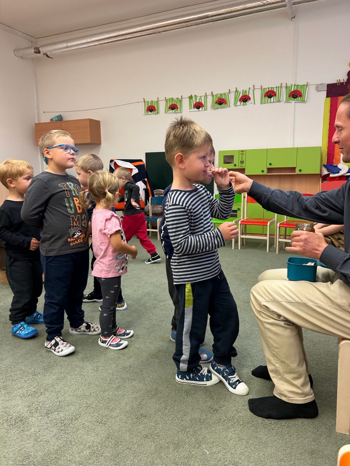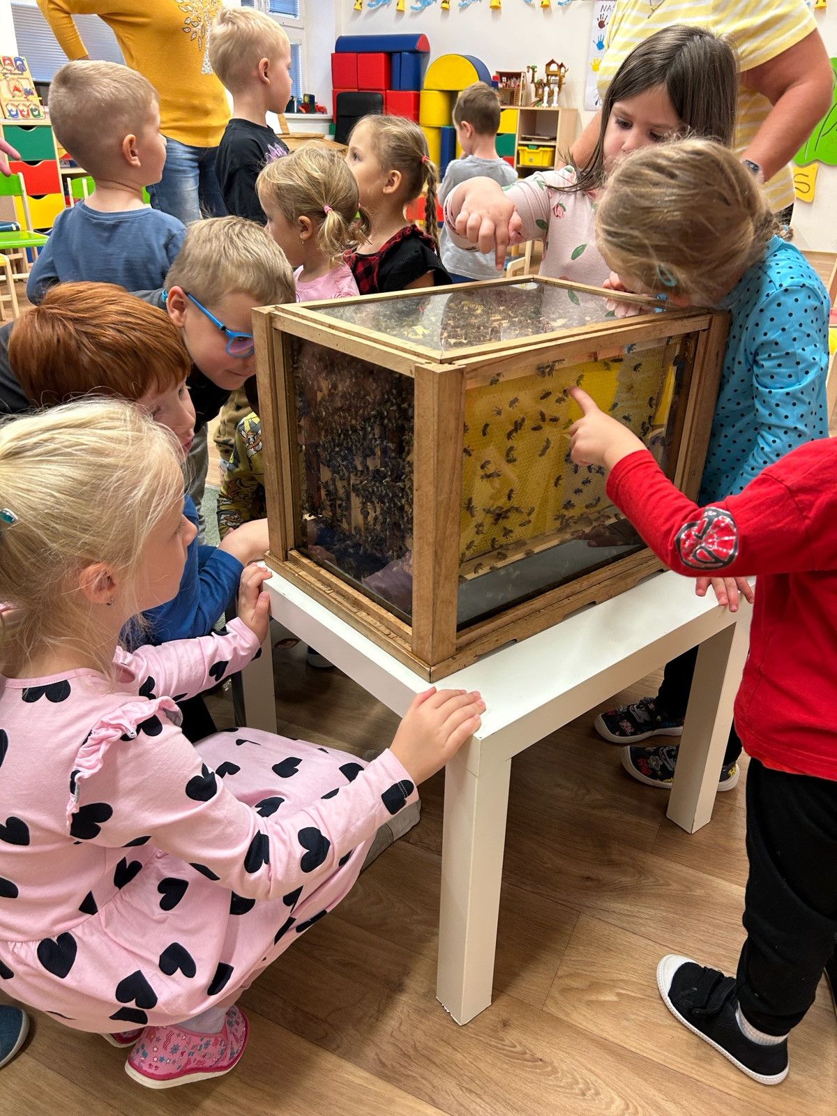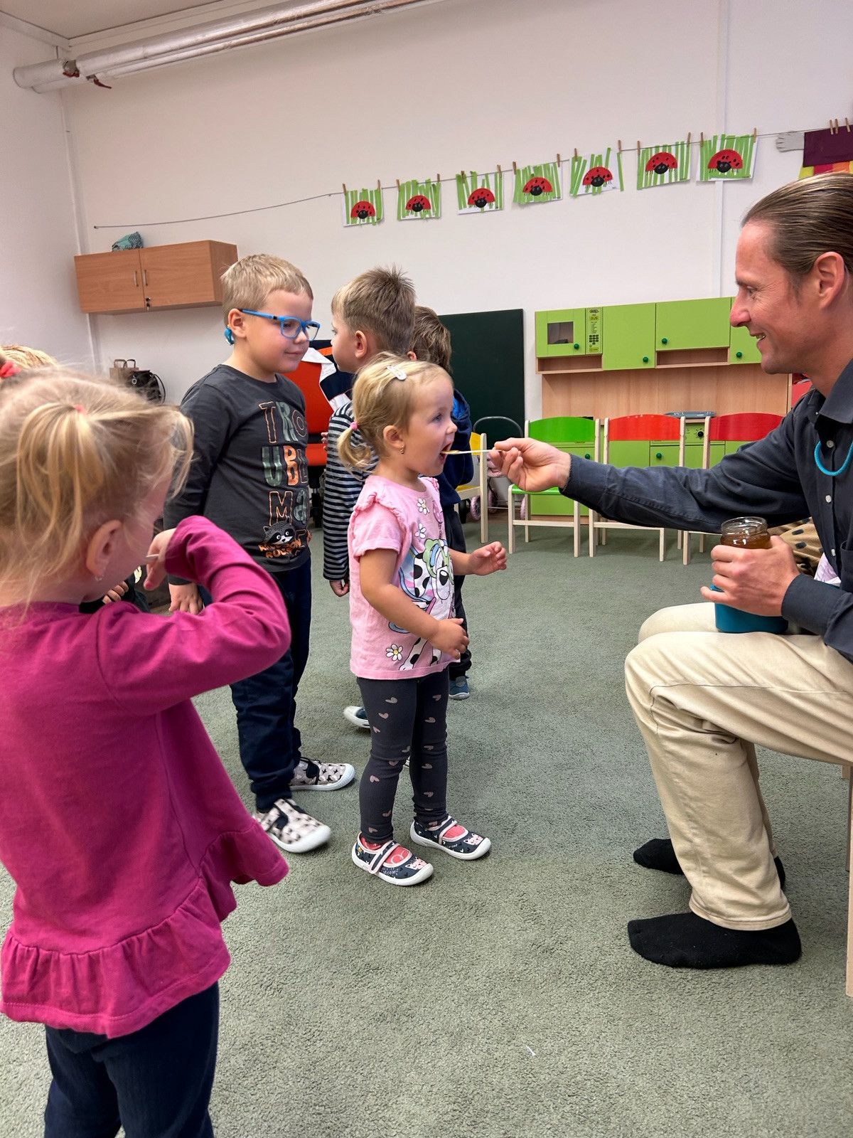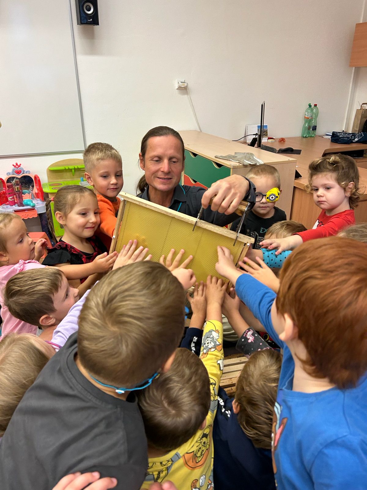 V pátek 26. 9. k nám do školky zavítal pan včelař a dětem zábavnou formou ukázal kousek ze života včel. Děti si mohly prohlédnout pomůcky, které včelaři používají, a zblízka viděly i samotné včelky. Velkým zážitkem byla ochutnávka medu, který všem moc chutnal. Na závěr měly děti prostor na otázky a pan včelař jim rád odpověděl.
