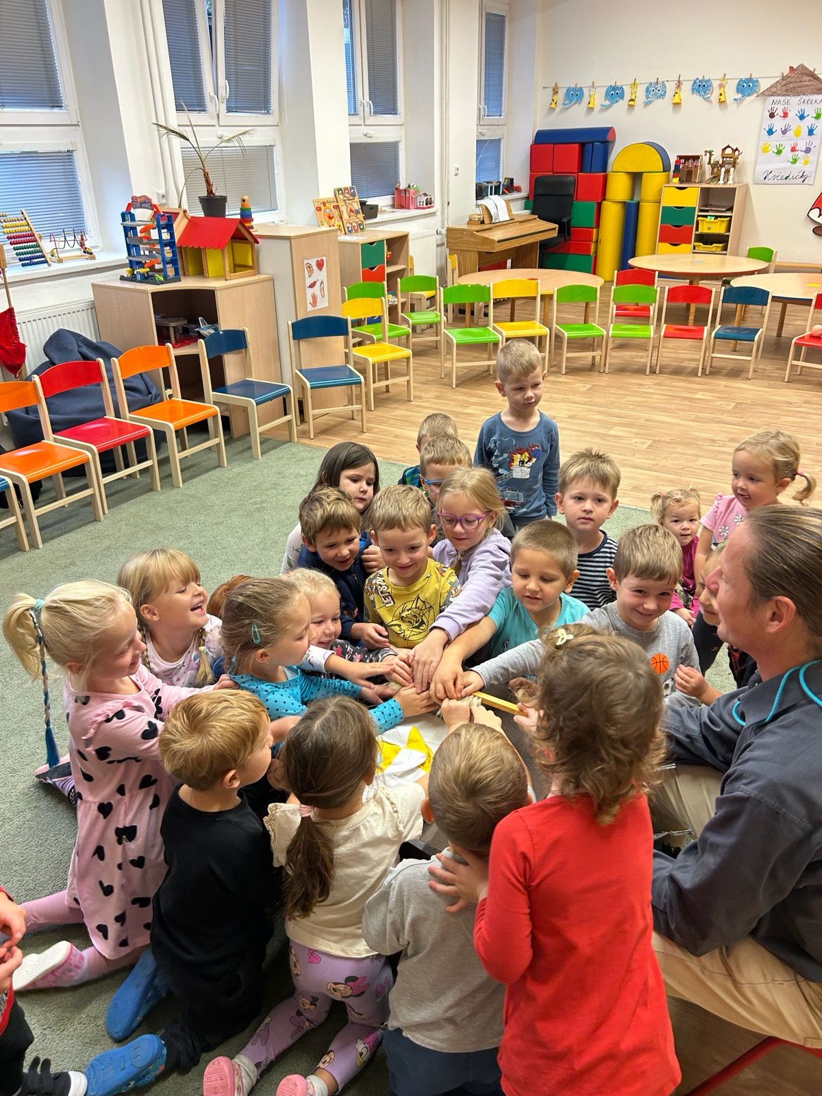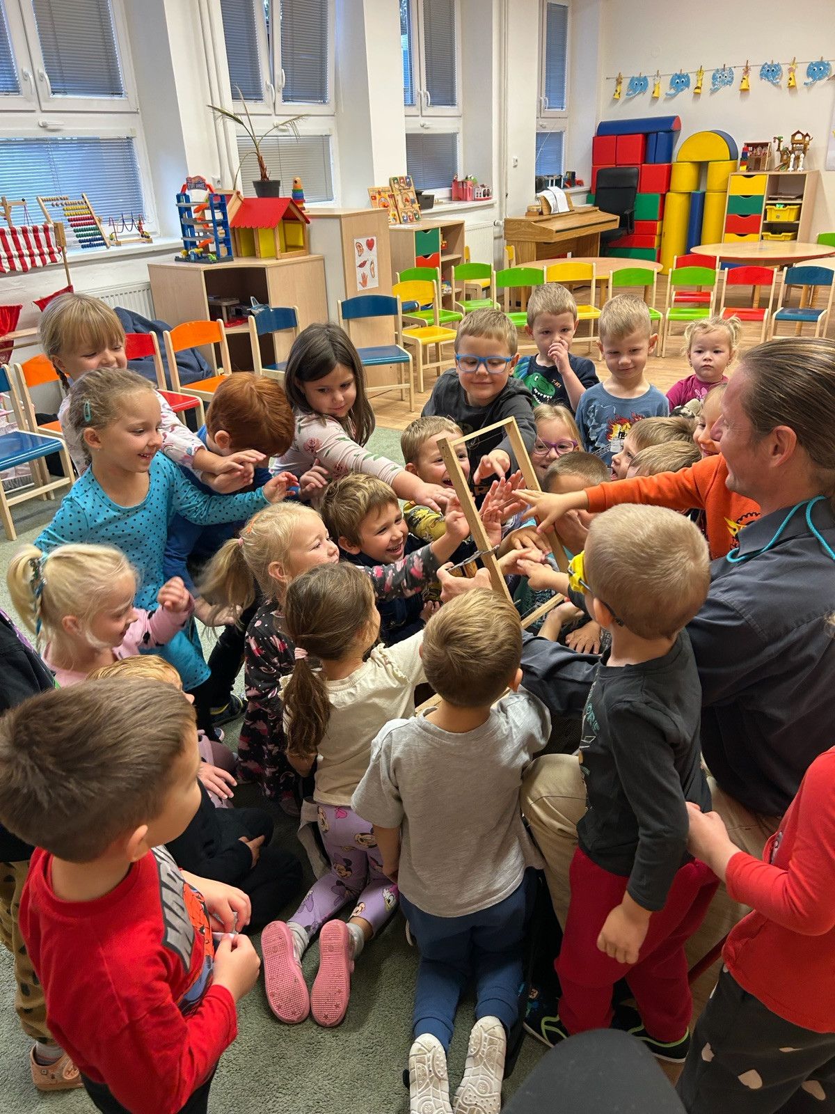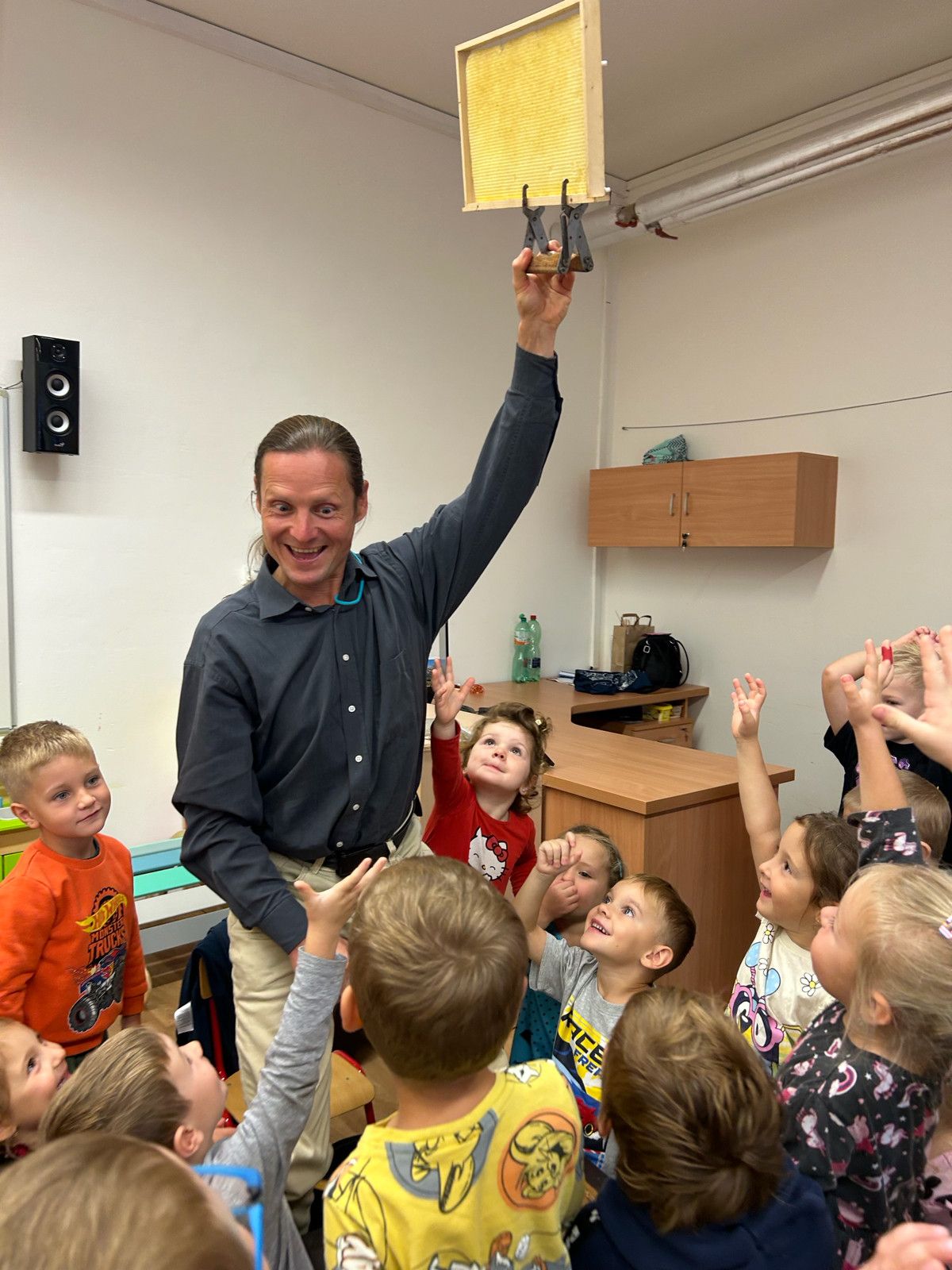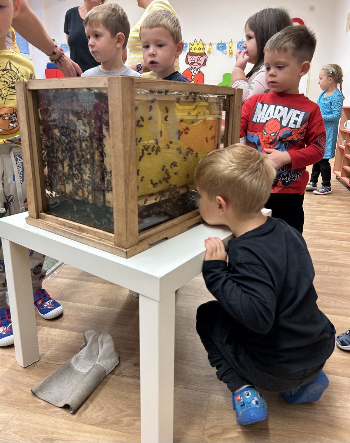V pátek 26. 9. k nám do školky zavítal pan včelař a dětem zábavnou formou ukázal kousek ze života včel. Děti si mohly prohlédnout pomůcky, které včelaři používají, a zblízka viděly i samotné včelky. Velkým zážitkem byla ochutnávka medu, který všem moc chutnal. Na závěr měly děti prostor na otázky a pan včelař jim rád odpověděl.